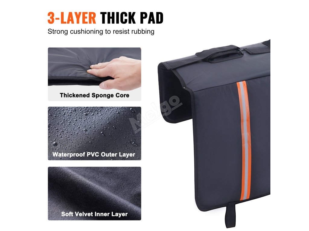 Naše podložka pod zadní dveře pro kola používá třívrstvé silné polstrování, které chrání vaše vozidlo před poškrábáním a poškozením způsobeným jízdními koly. Voděodolná vnější vrstva z PVC je nejen odolná proti opotřebení, ale také se snadno čistí. Měkká vnitřní strana z křišťálového semiše se jemně dotýká zadních dveří vašeho vozu a zajišťuje 100% ochranu.