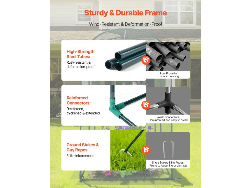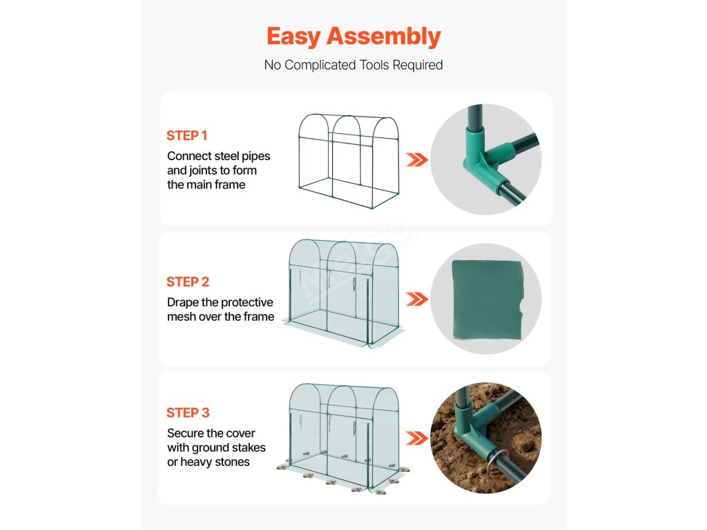 Tento stan na ochranu rostlin zahrnuje několik způsobů fixace. Zemní kolíky ukotvují rám v základně, zatímco napínací lana upevňují vrchní část k zemi a vytvářejí stabilní 3D oporu. Rozšířené okraje lze zatížit a vestavěné popruhy upevňují kryt k ocelové rámové trubce.