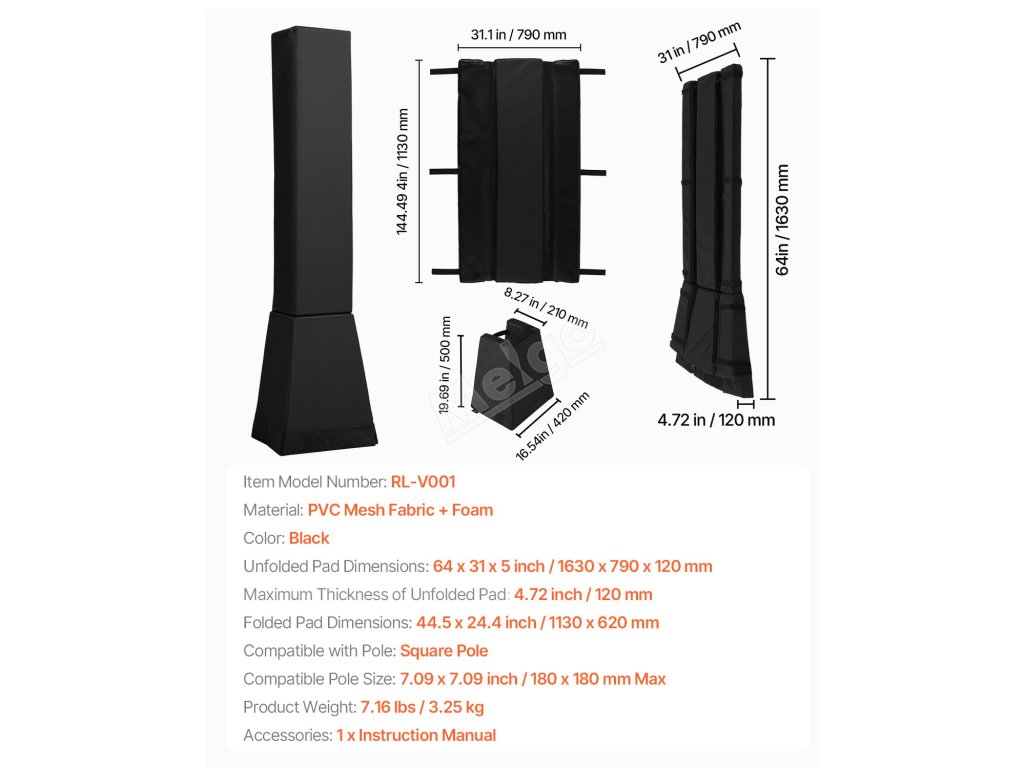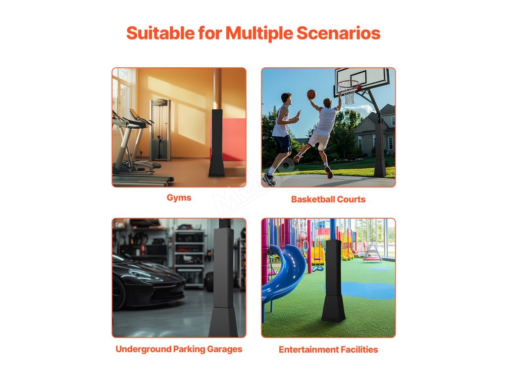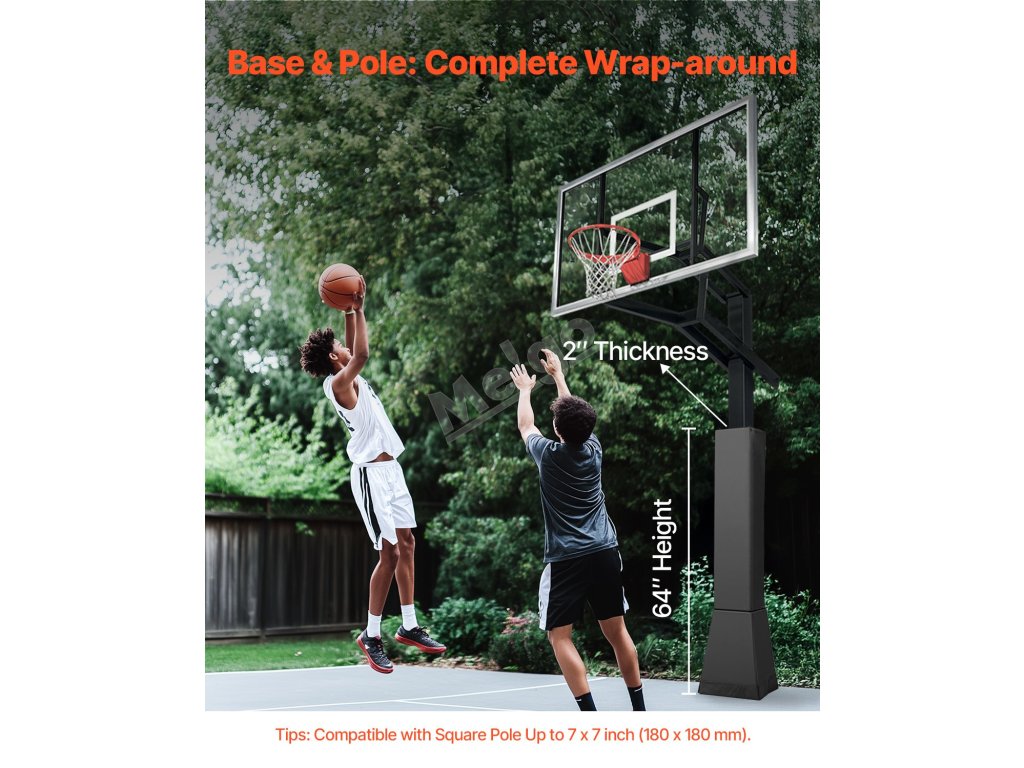 Tento chránič basketbalových tyčí vyrobený z prvotriedneho PVC materiálu je odolný proti opotrebovaniu a roztrhnutiu, takže časom nevybledne ani sa nedeformuje. Je navrhnutý pre štvorcovú tyč s trapézovou základňou s rozmermi 6x6-7x7 palcov (152x152-180x180 mm) a športovcom pomáha tlmiť nárazy. Ľahko sa inštaluje a poskytuje bezpečnosť pri hre.