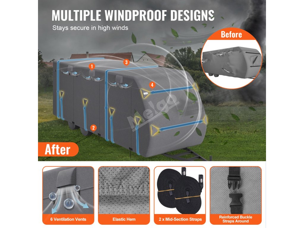 Šest větracích otvorů pomáhá uvolňovat silné proudění vzduchu, zatímco systém celoobvodových spon a popruhů udržuje tvar krytů pro obytné přívěsy. Tato konstrukce zabraňuje nafouknutí krytu při silném větru a zabraňuje jeho roztržení nebo odfouknutí.