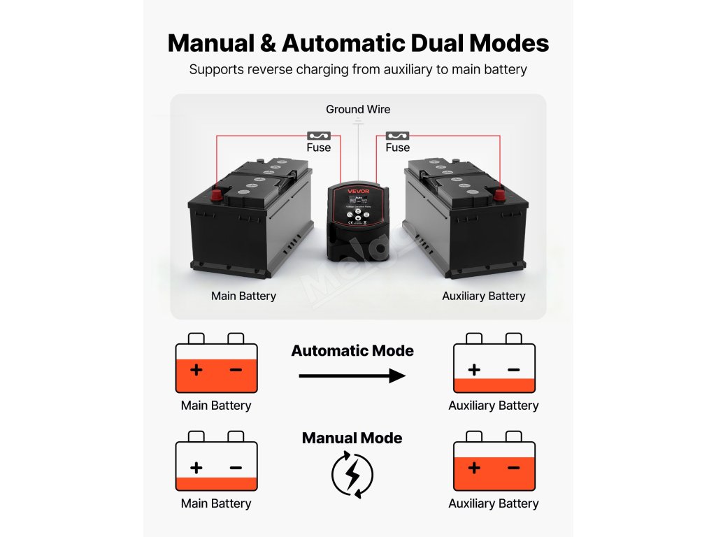 Duální izolátor baterií automaticky upravuje nabíjecí napětí podle různých typů baterií. Je široce kompatibilní s různými lithiovými bateriemi a olověnými akumulátory a zajišťuje efektivní práci různých typů baterií.