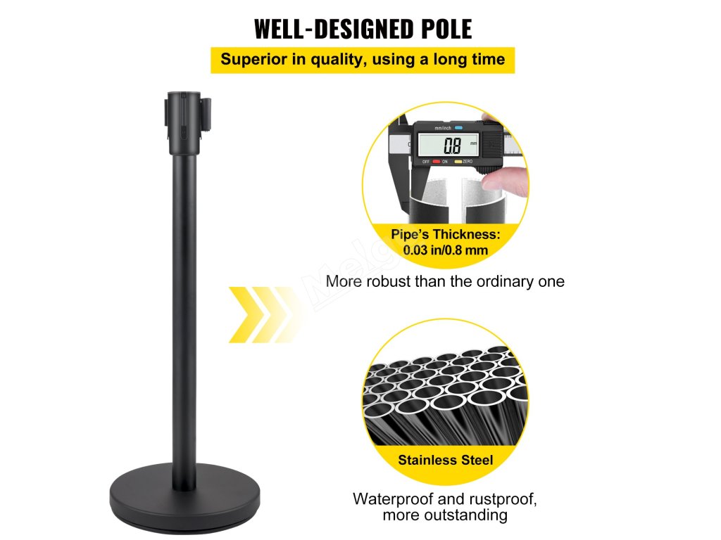 Stojany na kontrolu davu VEVOR sú vyrobené z vysokokvalitných materiálov. Má konštrukciu z nehrdzavejúcej ocele a železa. To zaručuje odolnosť a dlhú životnosť. Materiály vydržia časté používanie a náročné podmienky. Ich robustná konštrukcia zaručuje, že sa na ne môžete spoľahnúť na dlhšie obdobie. Betónová základňa dodáva ďalšiu odolnosť. Tieto stojany sú vyrobené tak, aby vydržali. Poskytujú spoľahlivé riešenie na kontrolu davu. Môžete veriť, že budú dlhodobo dobre fungovať. S týmito stĺpikmi získate kvalitu a odolnosť.