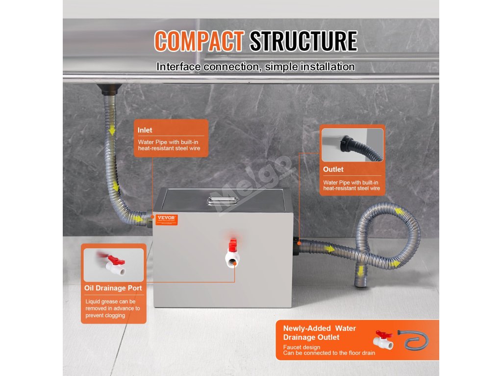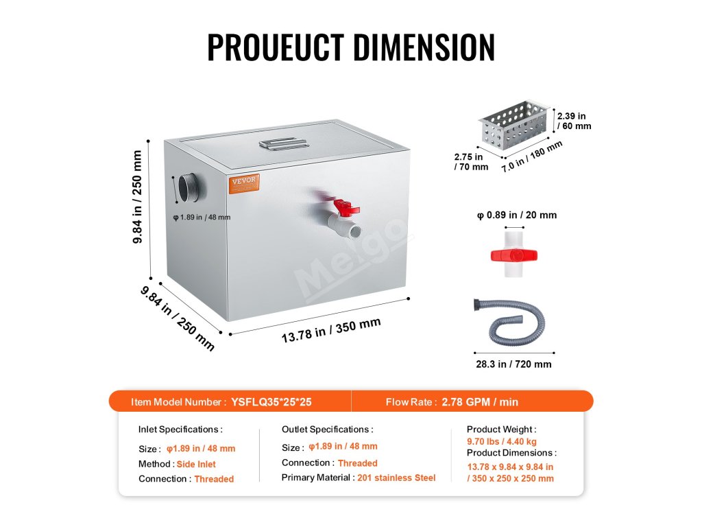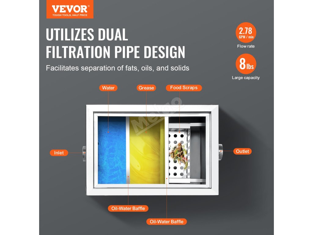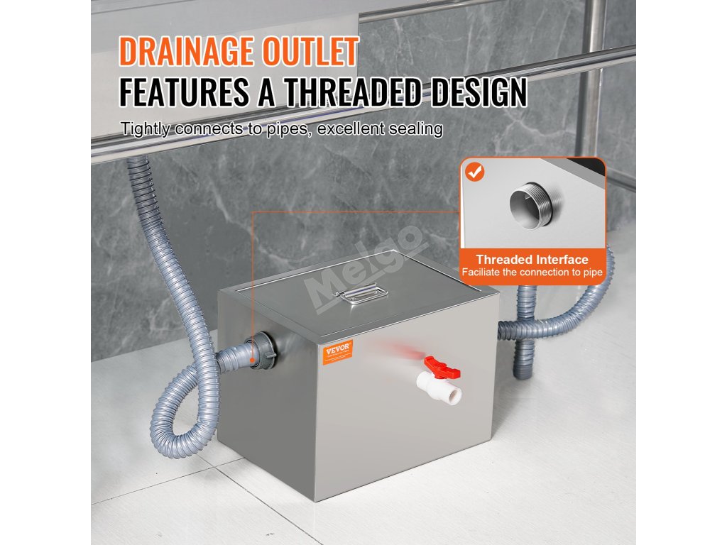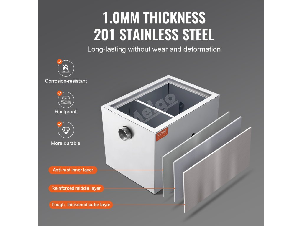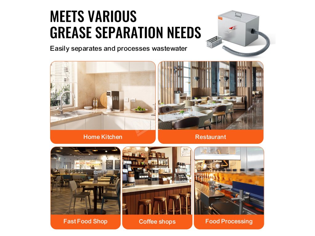 Tento komerční zachycovač tuků je vyroben výhradně z vysoce kvalitních materiálů, takže je pevný, odolný a nedeformuje se. Dodává se s kompletní sadou příslušenství.