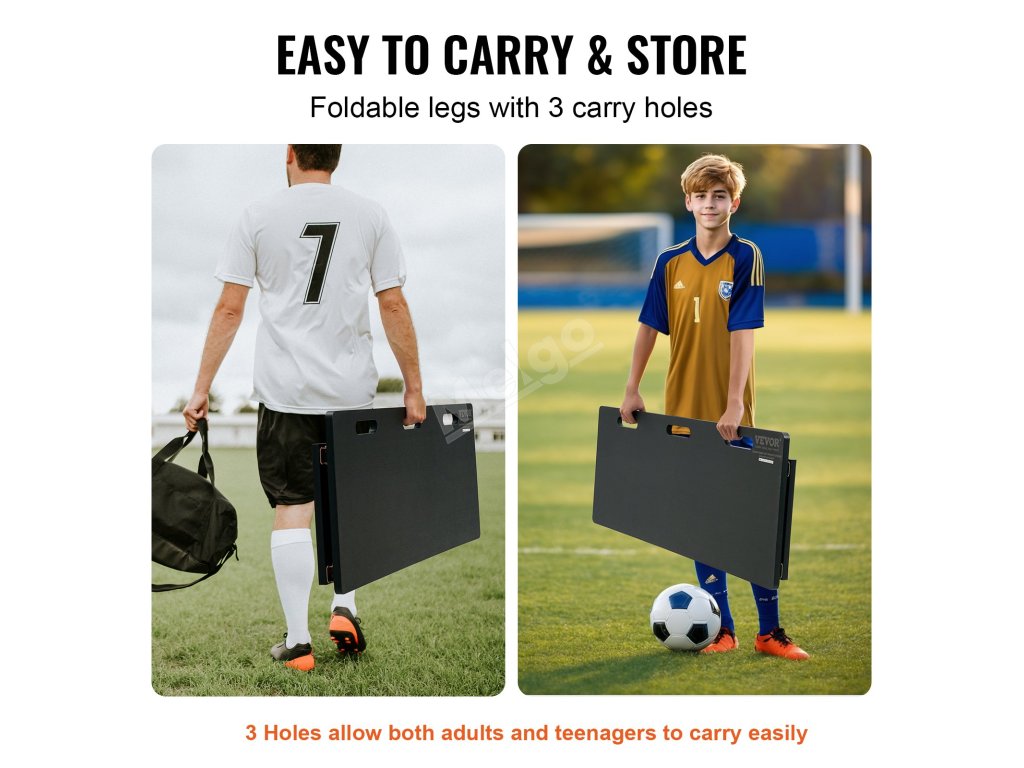 3 otvory pro přenášení navržené pro snadné přenášení. Naše přenosná fotbalová stěna je díky svému pohodlnému designu vhodná pro dospělé i teenagery.