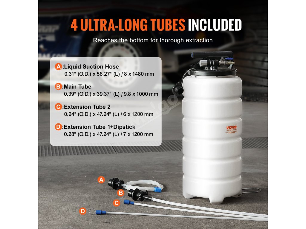 Naše komplexní sada pro odsávání oleje obsahuje hlavní trubku, měrku, dvě prodlužovací trubky, hadici pro odsávání kapaliny a dva těsnicí kroužky - každý z nich je přesnou součástí zajišťující hladký průběh odstraňování kapaliny.