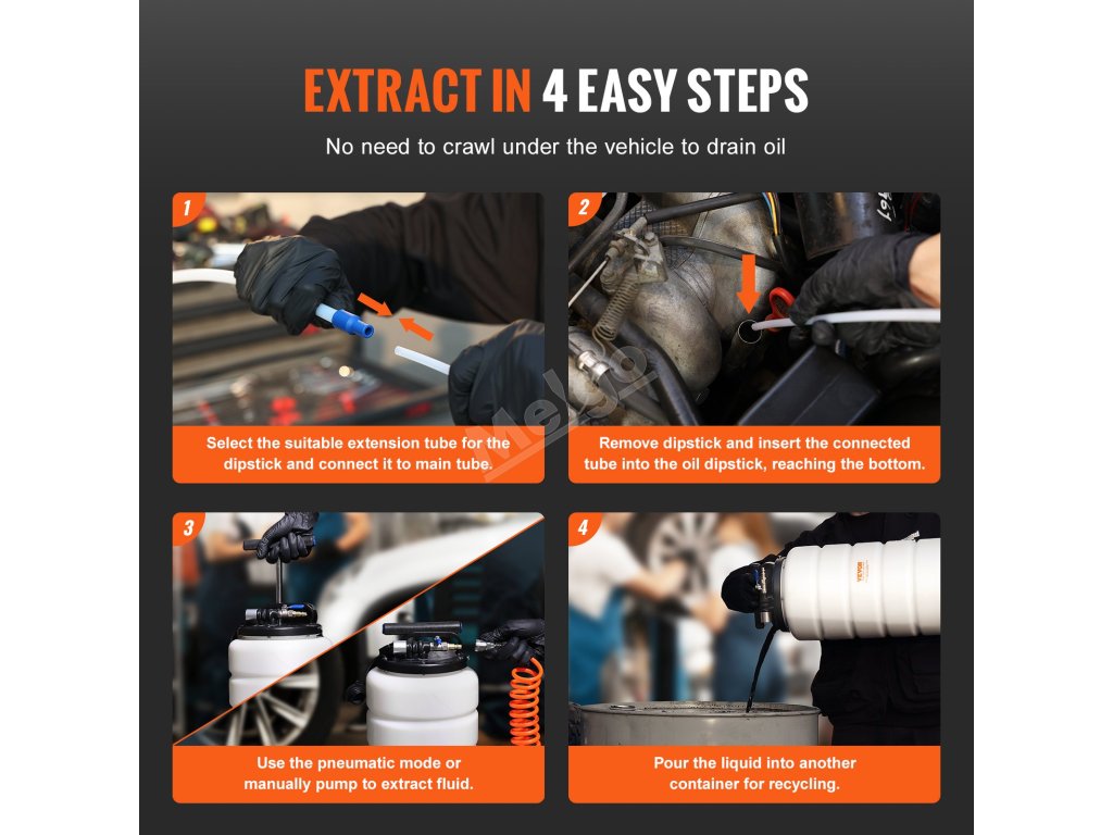 Naše čerpadlo na extrakci oleje dokáže extrahovat většinu typů kapalin včetně motorového oleje, převodového oleje, kapaliny posilovače řízení a brzdové kapaliny. Je ideální pro automobily, motocykly, sekačky na trávu, traktory a další zařízení.