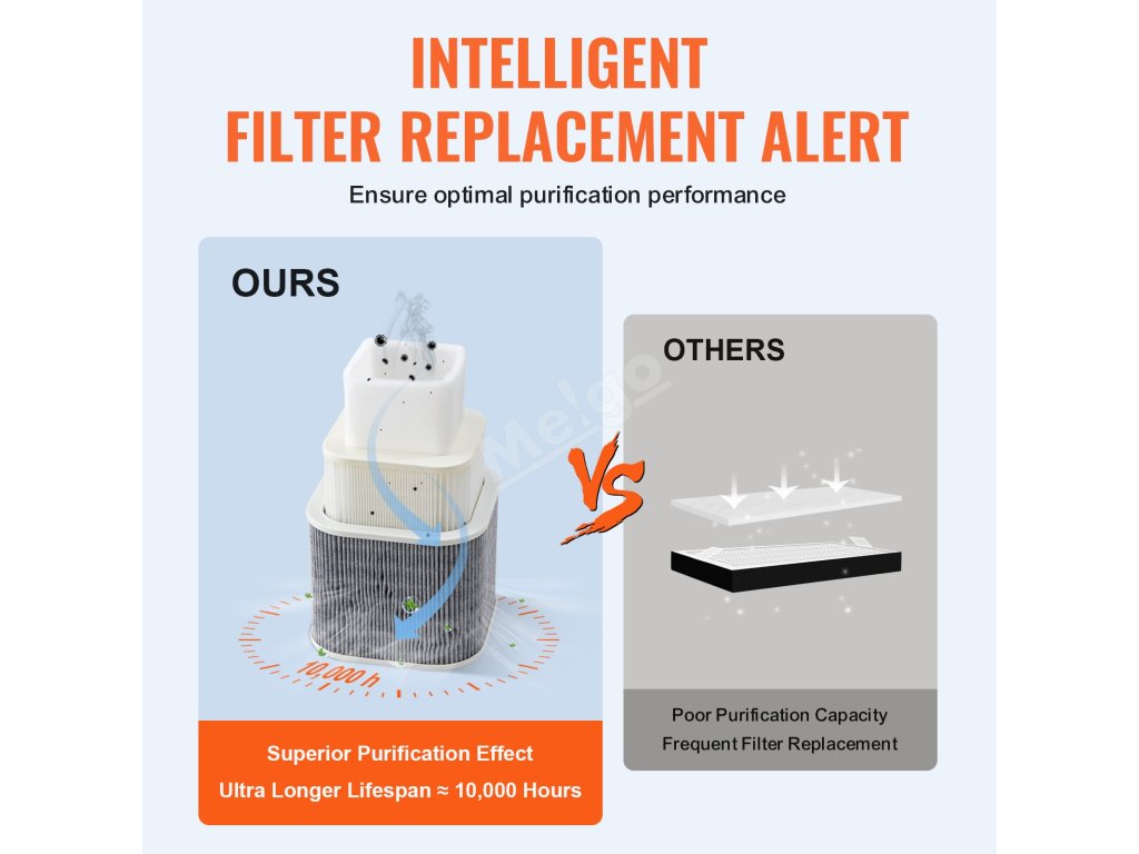 Předpokládaná životnost filtračního prvku je 10 000 hodin, což zaručuje dlouhou životnost a eliminuje nutnost časté výměny. Když je čas vyměnit filtrační prvek, vydá zvukový signál, který vám to připomene.