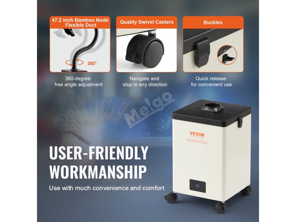 47.2palcová flexibilní hadice, kterou lze volně ohýbat, spolu se 4 vysoce kvalitními univerzálními kolečky (2 s brzdou), která usnadňují přesun a zajištění v jakékoli poloze. Vysoce těsnicí konstrukce zajišťuje, že kovové západky pevně uzavírají hlavní objem filtru, zcela utěsňují výpary a zabraňují jakémukoli úniku.