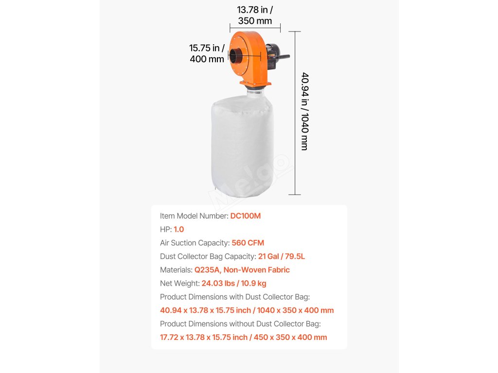 | Rozměry výrobku bez prachového sáčku | 17.72 x 13,78 x 15,75 palců / 450 x 350 x 400 mm |