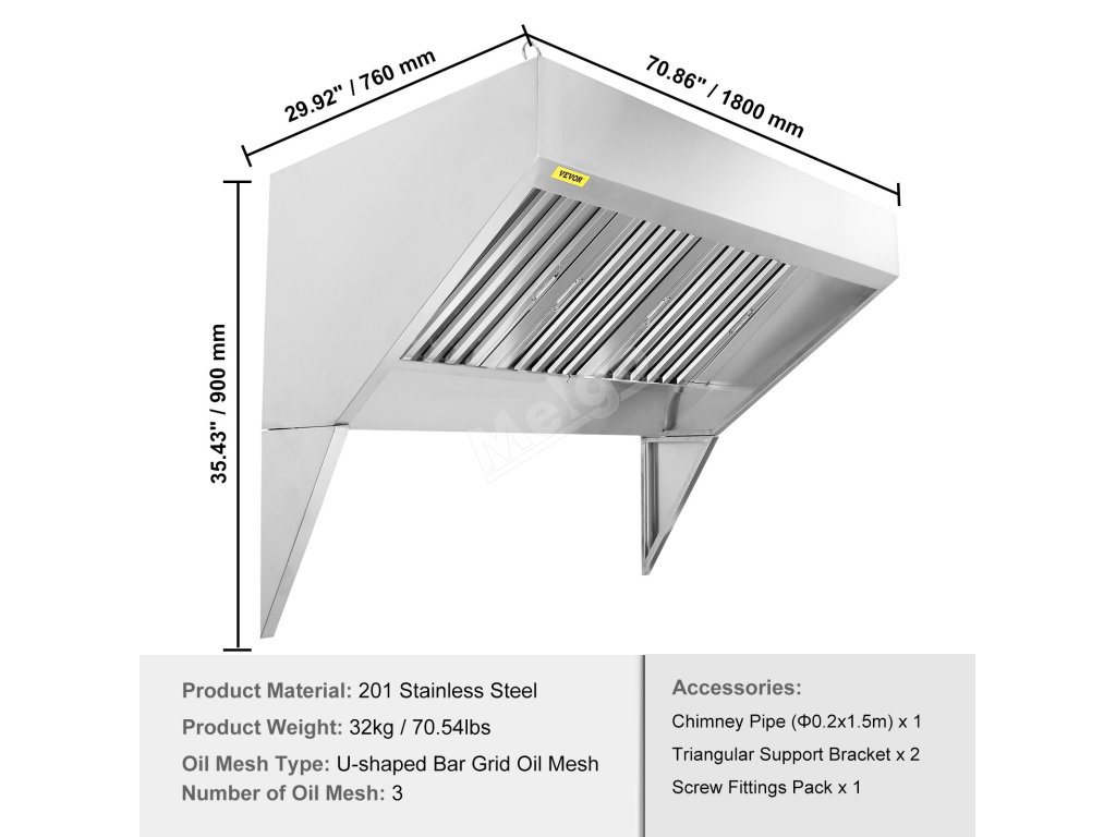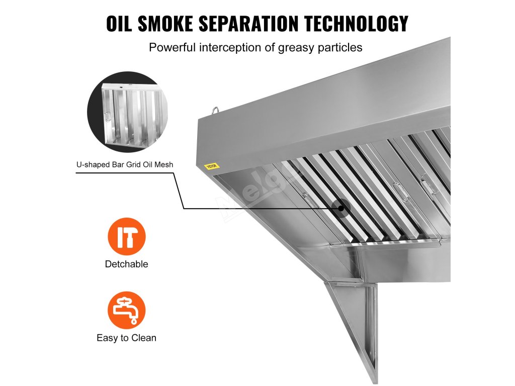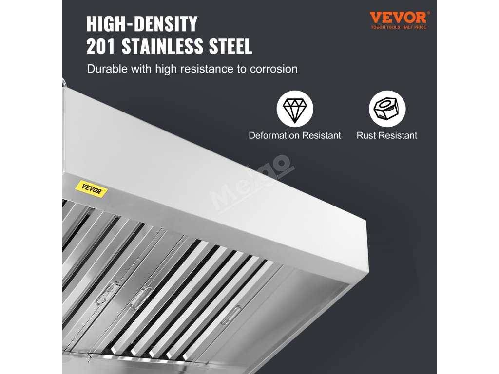 Komerční odsavač par VEVOR 201 z nerezové oceli, optimalizovaný pro snadné čištění, instalaci a výkon. Ve spojení s velkou plochou pro zachycení kouře o velikosti 70,86 palce a vylepšenou síťkou olejového filtru ve tvaru písmene U dokáže bez námahy odstranit kouř a pachy, aby váš kulinářský prostor zůstal svěží a čistý!