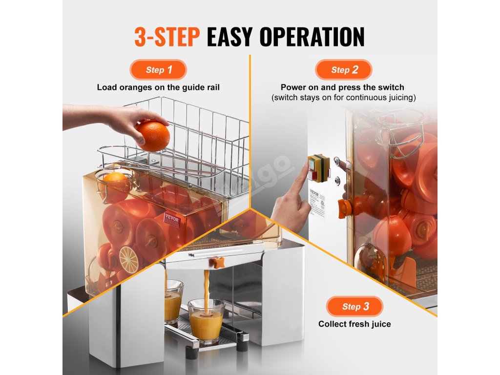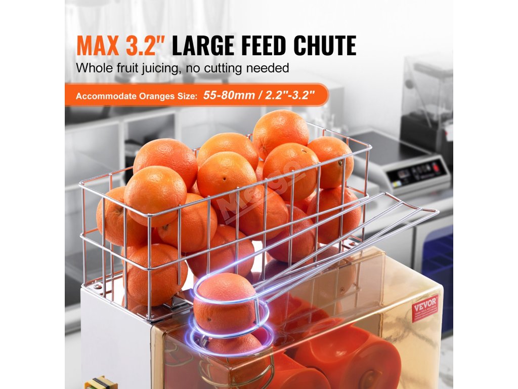 Průměr odšťavňovací koule tohoto komerčního odšťavňovače pomerančů byl vylepšen na 76 mm/2,99 palce, což vede k lepší výtěžnosti šťávy a rychlejšímu provozu.