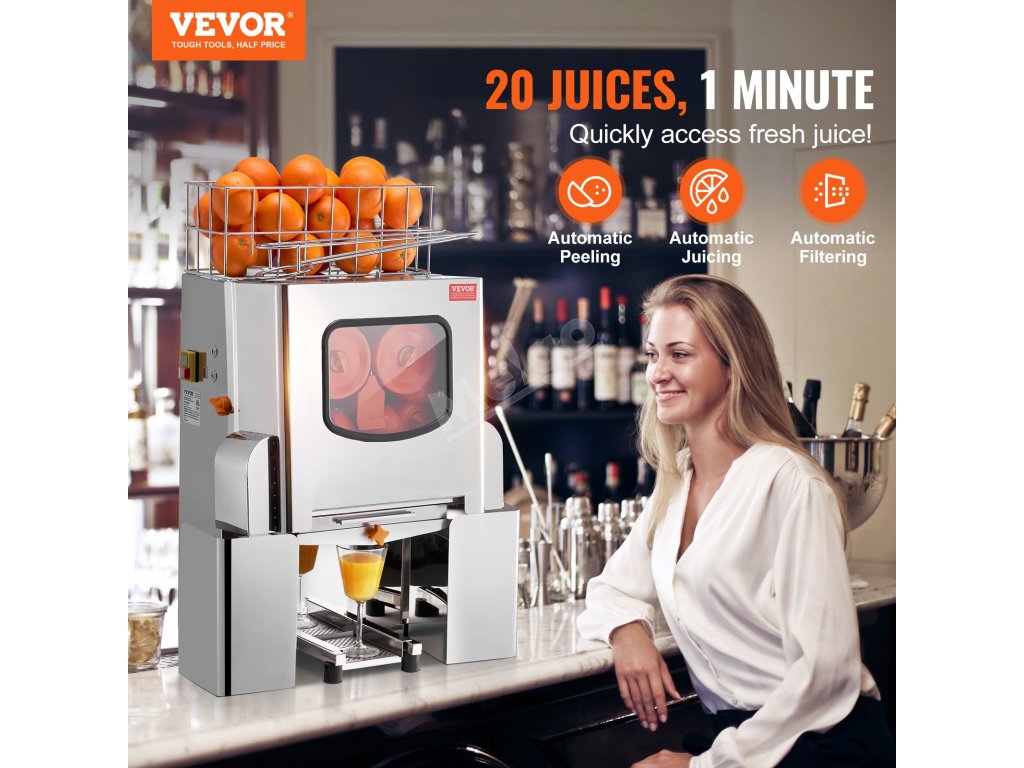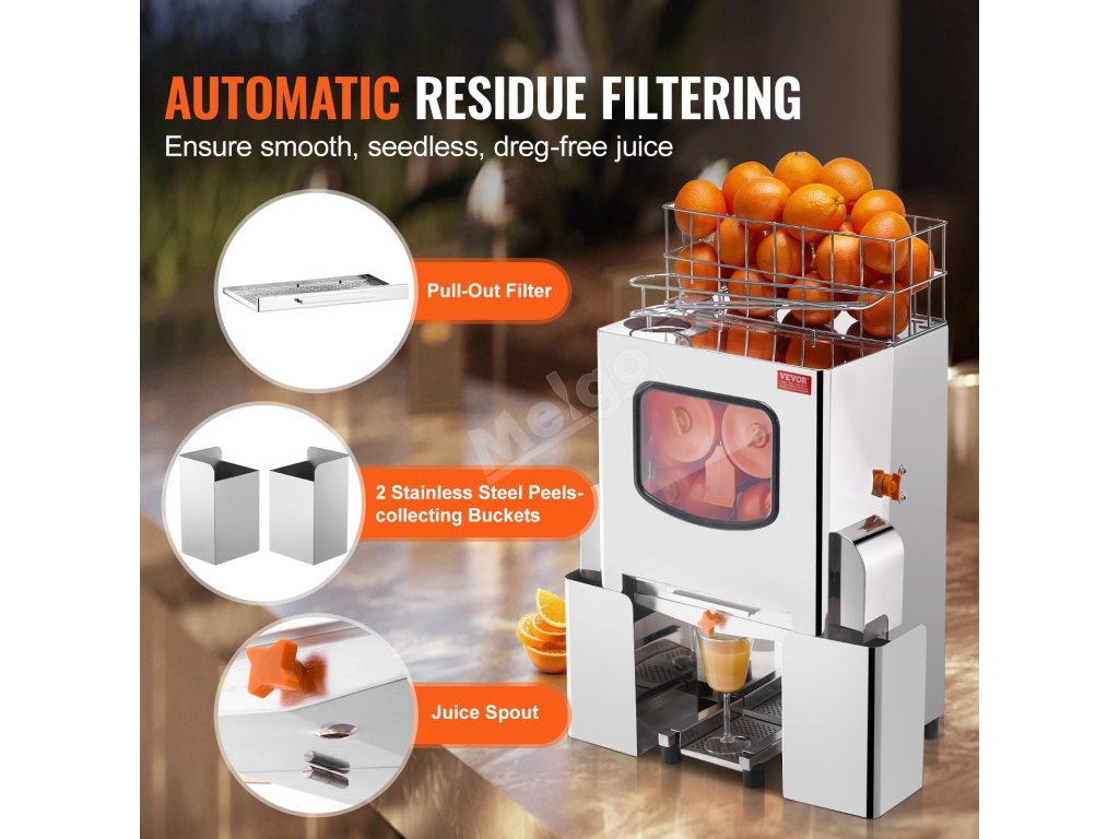 Náš komerční odšťavňovač pomerančů je vyroben z vysoce kvalitní potravinářské nerezové oceli SUS304 a zaručuje špičkový výkon. Efektivně získává šťávu z pomerančů a zároveň bezproblémově kombinuje automatické loupání a automatické filtrování. Vychutnejte si čistou čerstvou šťávu bez přídavných látek.