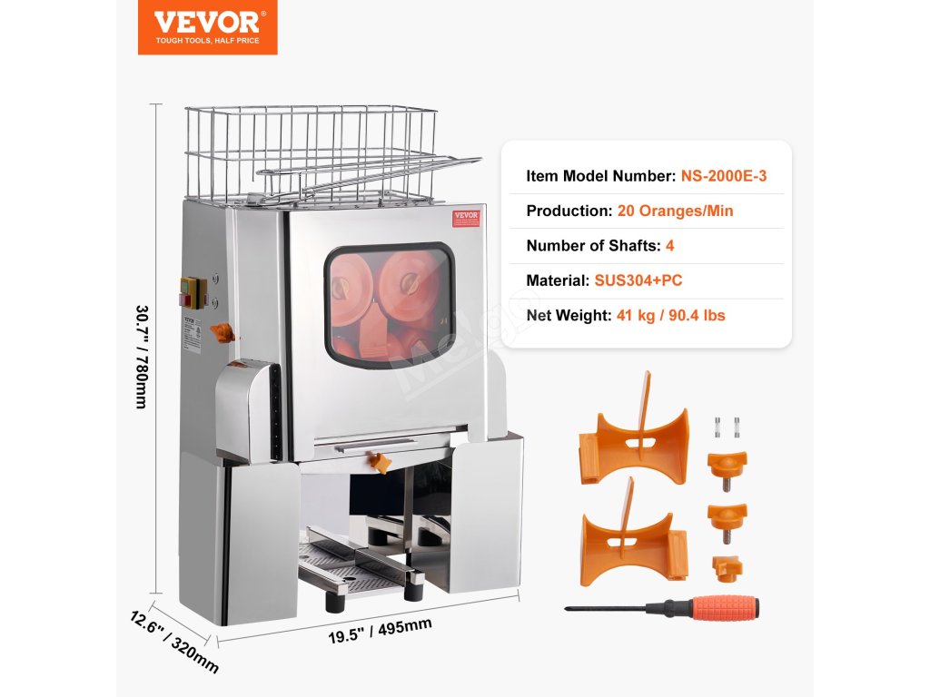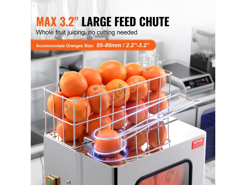 Průměr odšťavňovací koule tohoto komerčního odšťavňovače pomerančů byl vylepšen na 76 mm/2,99 palce, což vede k lepší výtěžnosti šťávy a rychlejšímu provozu.