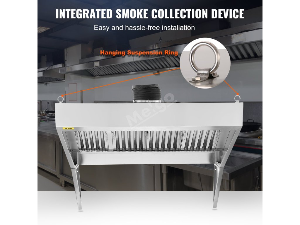 Komerční odsavač par VEVOR 201 z nerezové oceli, optimalizovaný pro snadné čištění, instalaci a výkon. Ve spojení s 106,3 palce velkou plochou pro zachycení kouře a vylepšenou síťkou olejového filtru ve tvaru písmene U dokáže bez námahy odstranit kouř a pachy, aby váš kulinářský prostor zůstal svěží a čistý!