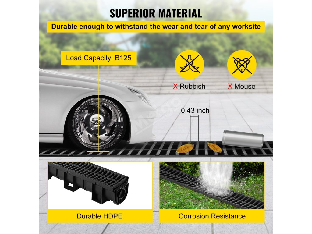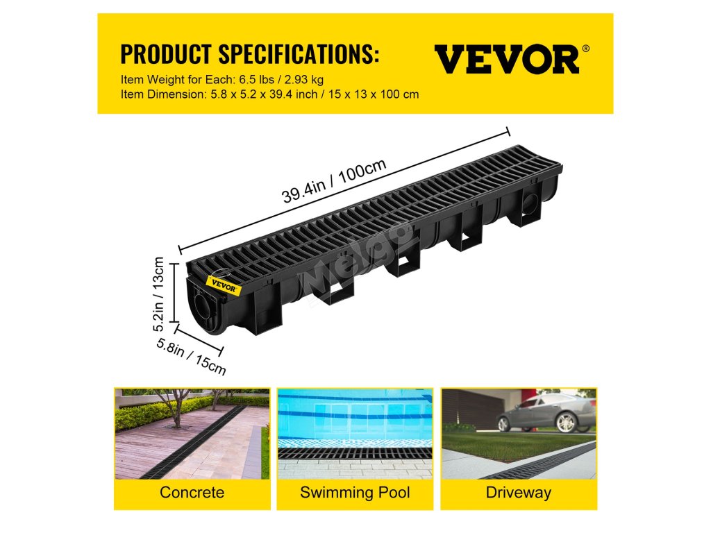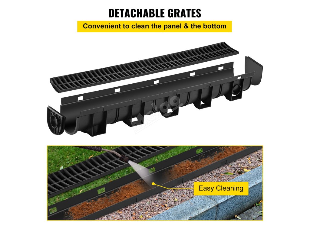 Systém odvodnenia priekopy VEVOR sa vyznačuje elegantným dizajnom. Čierny plastový rošt dodáva moderný vzhľad. Zlepšuje tak estetiku vášho priestoru. Dobre sa hodí k rôznym nastaveniam. Vyzerá dobre, či už ide o záhradu, príjazdovú cestu alebo garáž. Aj vďaka elegantnému štýlu pôsobí menej rušivo. Bez problémov sa začlení do vášho prostredia. Nijako však nevyniká. Nie všetko je pravda. To znamená, že jeho vzhľad neohrozuje jeho funkčnosť. Svoju hlavnú úlohu teda stále plní efektívne. K dispozícii je štýl aj obsah. Vyberte si ho pre jeho atraktívny vzhľad a praktickosť.