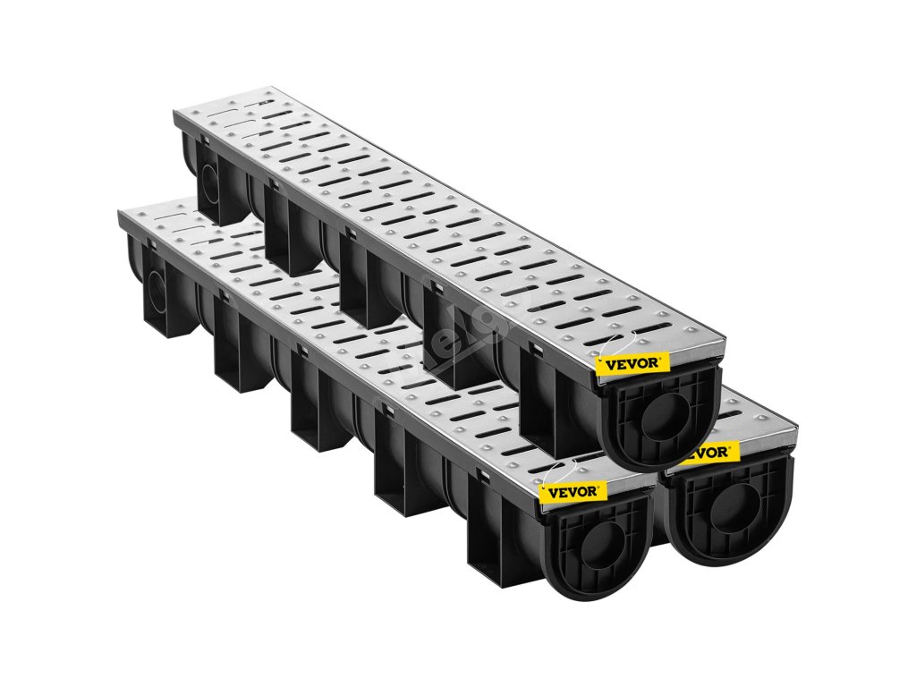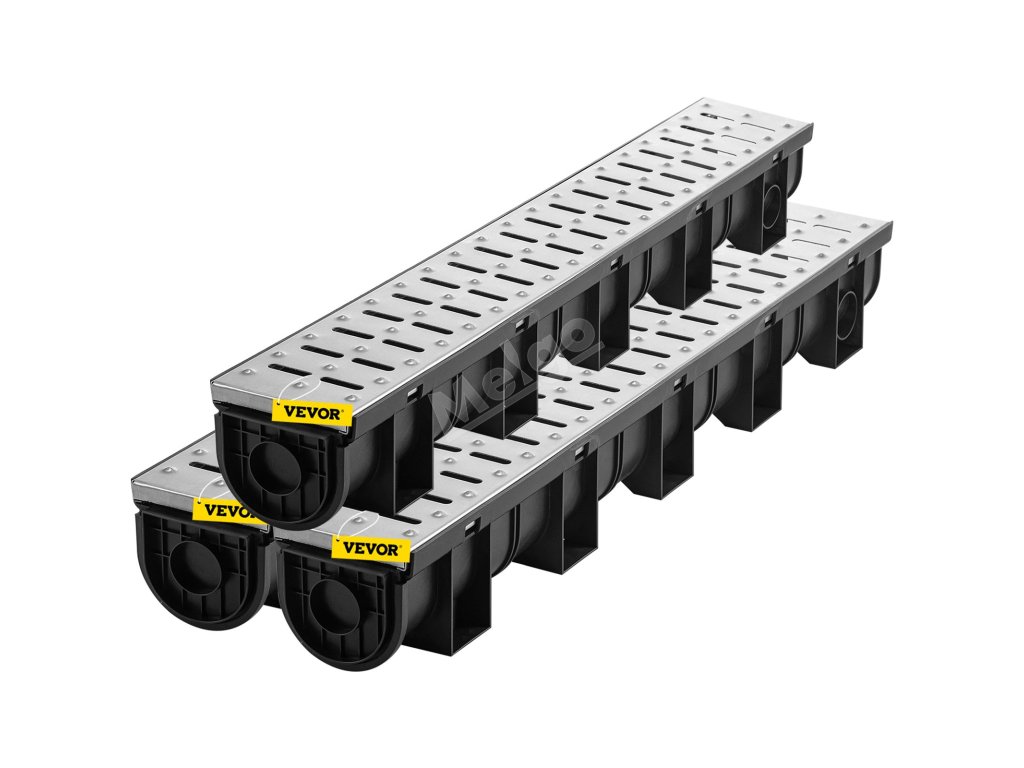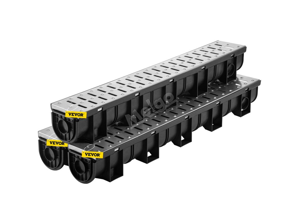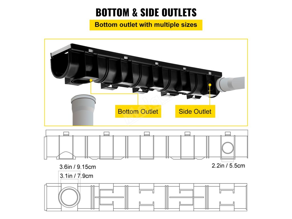 Ak sa teda chystáte kúpiť výkopový odvodňovací systém, uistite sa, že ste si kúpili dvojvýtokový odvodňovací kanál. Kde môžete takýto odtokový kanál získať? Odtokový kanál VEVOR si stačí len objednať. Je vybavený dvoma odtokovými otvormi, jedným na dne a jedným na boku. Spodný odtok sa dodáva v rôznych veľkostiach, napríklad 2,2 palca a 3,1 palca, a bočný odtok má veľkosť 2,2 palca.
