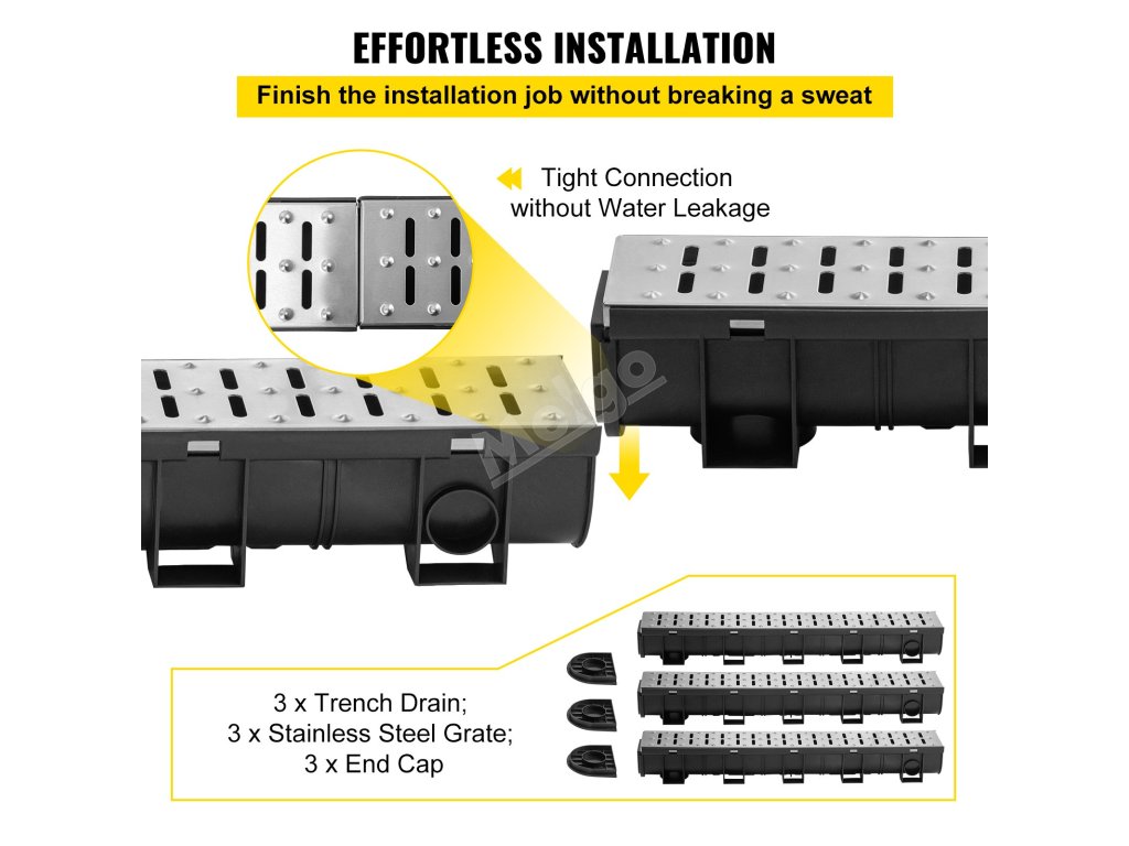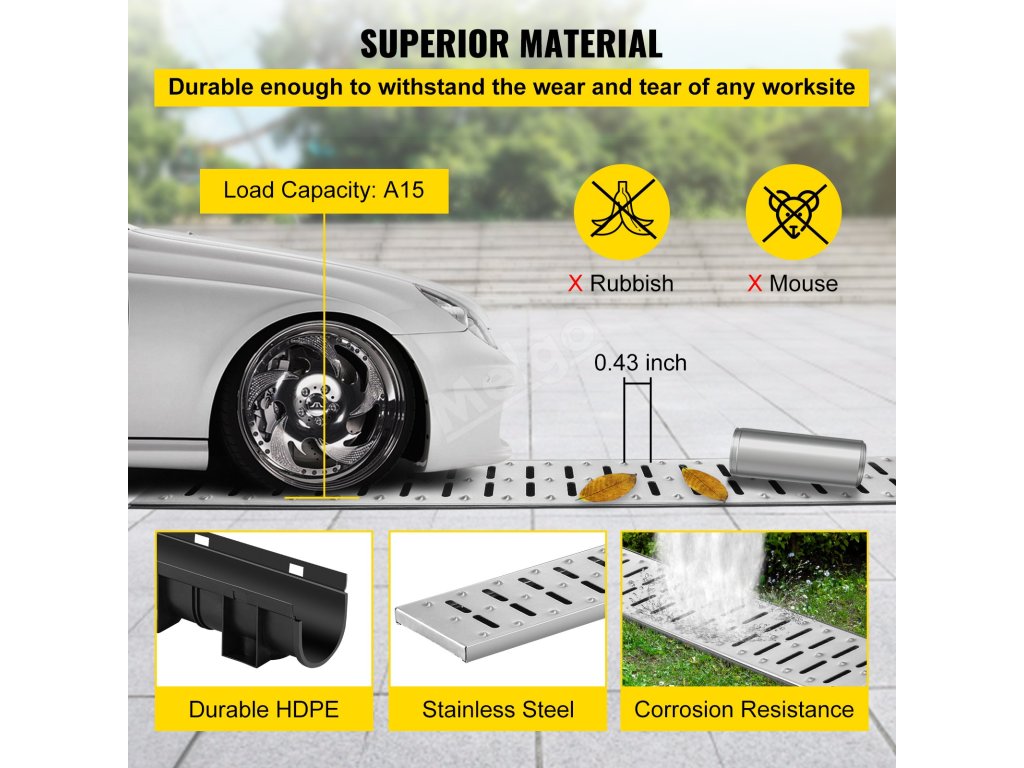Kanálový odtokový rošt VEVOR je vyrobený z pevného HDPE plastu a nehrdzavejúcej ocele. Vydrží zaťaženie A1G a je odolný voči korózii a hrdzi. Takže bez ohľadu na to, kde chcete tento systém odtoku vody z výkopu nainštalovať, zvládne veľkú záťaž bez toho, aby sa zlomil alebo zhrdzavel, a poskytne vám trvanlivý zážitok.