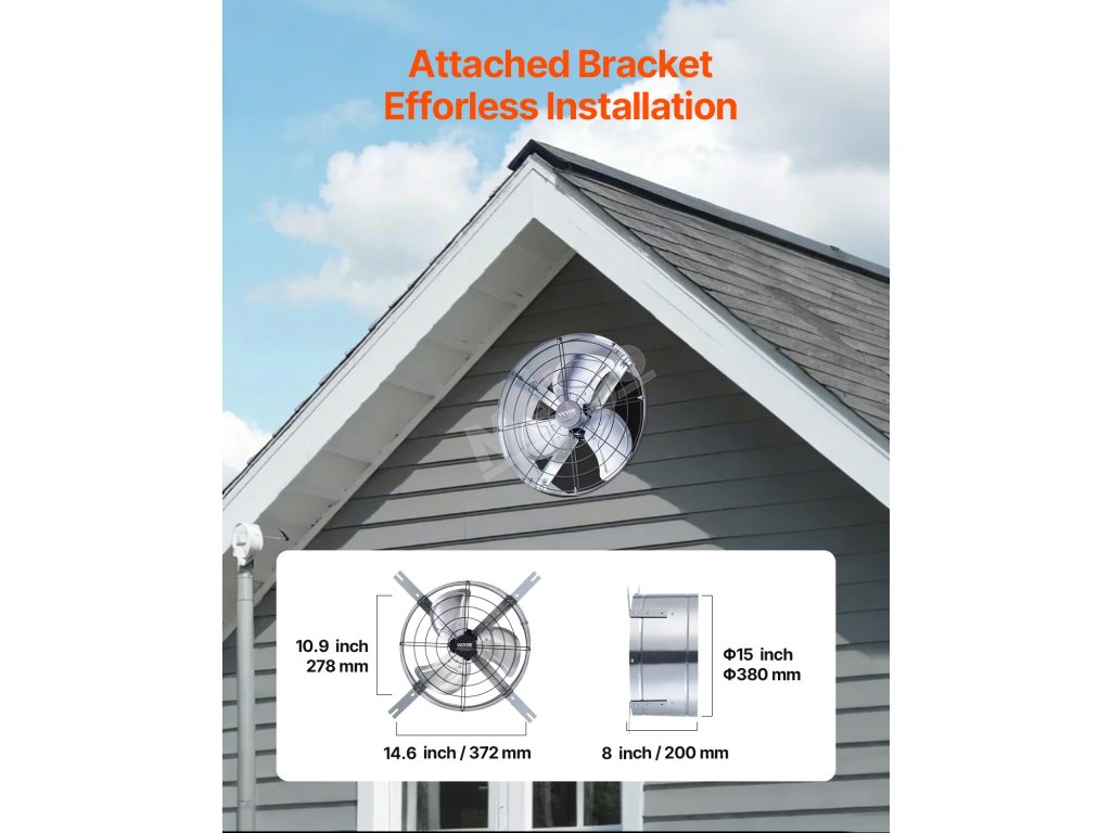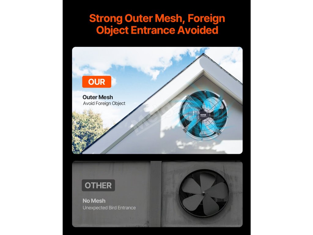 Tento štítový ventilátor vybavený vysokorýchlostným motorom poskytuje silný prúd vzduchu, ktorý rýchlo vyháňa horúci vzduch a znižuje teplotu v podkroví.