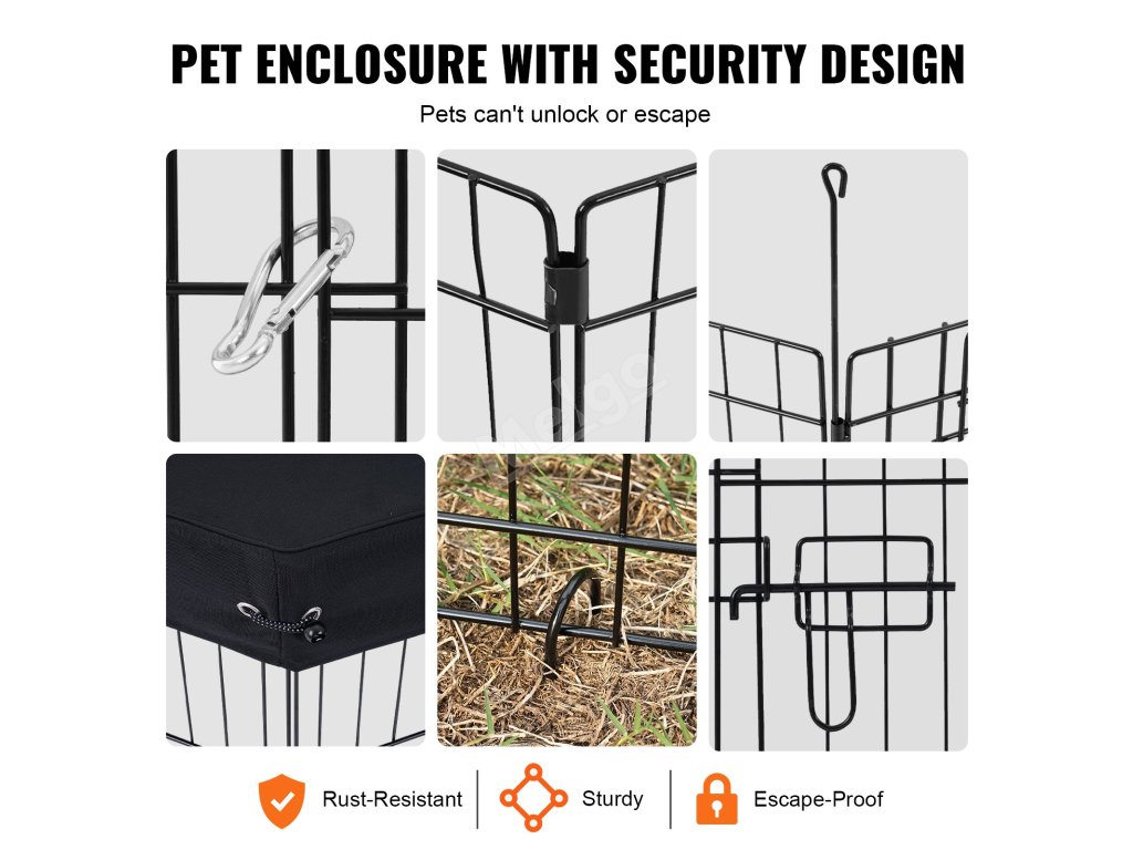 Ohrádka pro zvířata je bezpečně ukotvena, aby se nemohla posunout, a její dvířka jsou opatřena zámky, které zajišťují, že zvířata nemohou bránu otevřít. Robustní kovový materiál je odolný proti rozkousání a zabraňuje převržení nebo poškození ohrádky domácími zvířaty, což vám zajistí klid, když jsou domácí zvířata ponechána bez dozoru.