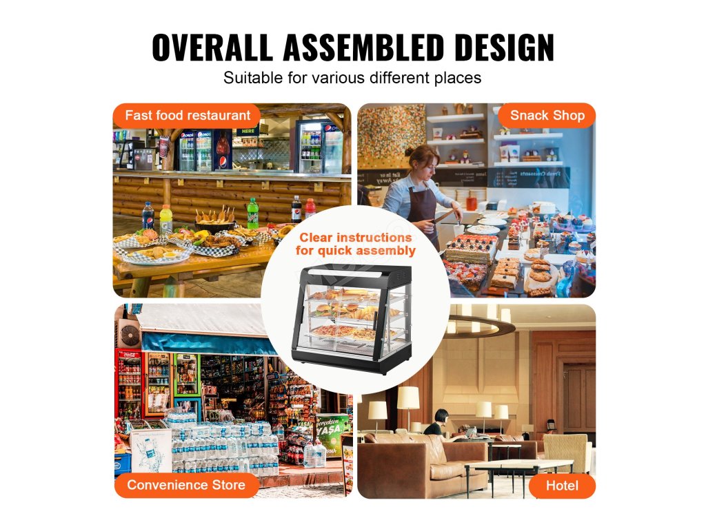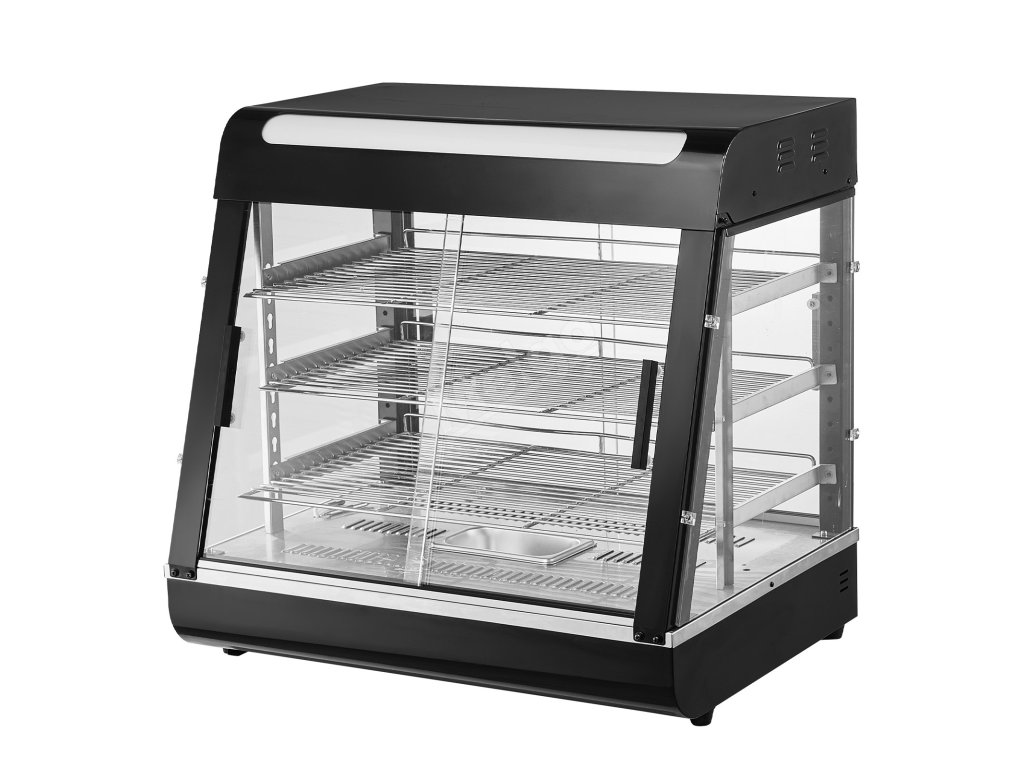 Vitrína na potraviny je vybavena 3 nastavitelnými policemi, které poskytují dostatek úložného prostoru pro vystavení pizzy, hamburgerů, smažených kuřat, hot dogů a dalších potravin. Široké využití v pekárnách, kavárnách a jídelnách.