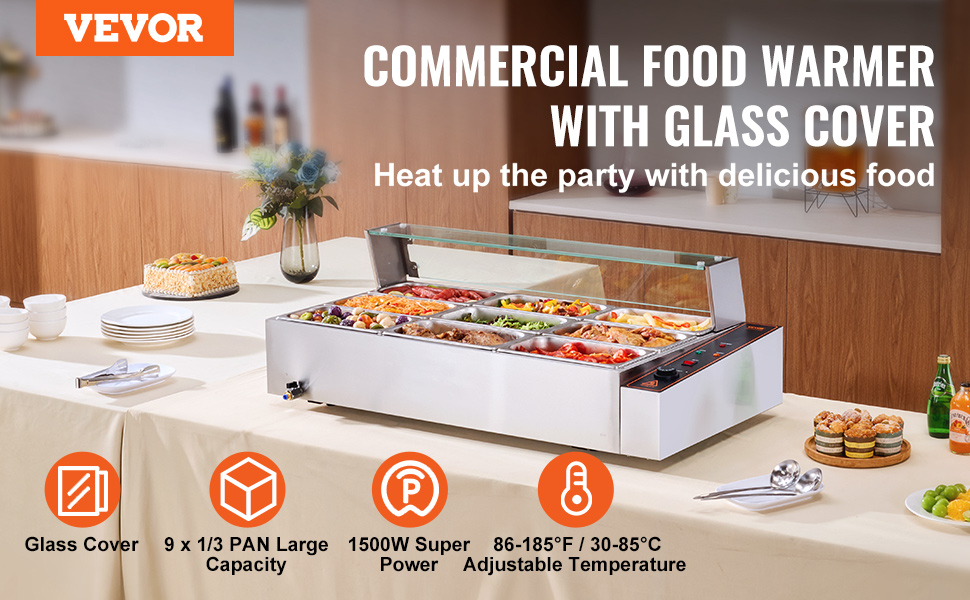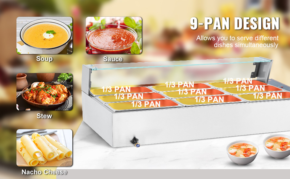 Tento ohřívač potravin s 9 nerezovými nádobami a skleněným krytem je vybaven systémem suchého spalování a tlačítkem reset pro ochranu před poškozením. Teplotní rozsah 86 - 185℉ / 30 - 85 ℃ umožňuje zvolit ideální nastavení, aby bylo jídlo kdykoli horké a připravené k servírování.