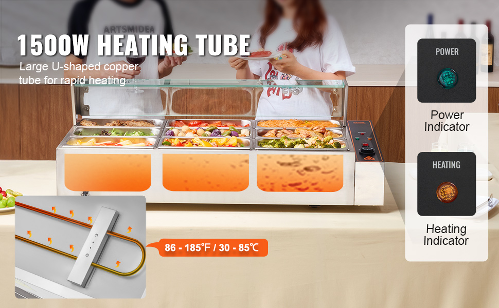 Topné těleso v ohřívači je pečlivě navrženo pro rychlý a rovnoměrný ohřev a nabízí větší plochu pro účinný přenos tepla. Teplotu můžete snadno nastavit v rozmezí 86 - 185℉ / 30 - 85 ℃, čímž zajistíte, že vaše jídlo zůstane při servírování v ideální teplotě.