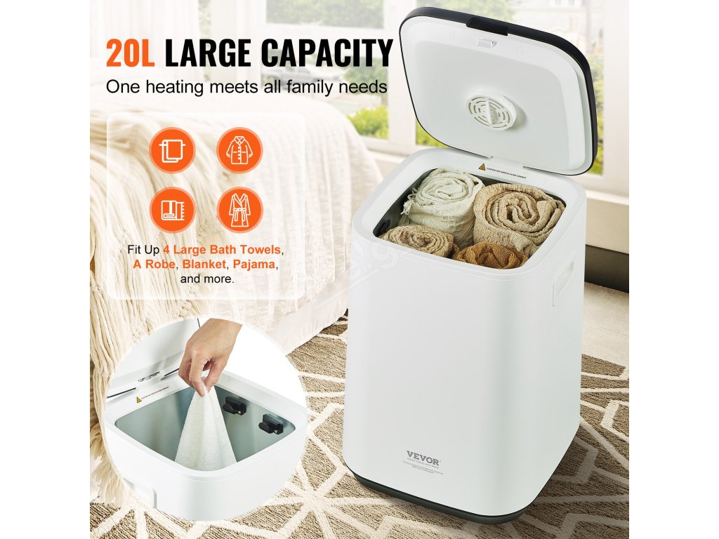 Chytrý ohřívač ručníků pojme dva velké ručníky (70 x 40 palců / 177,8 x 101,6 cm), župany, deky, pyžama atd. Jediná ohřívací jednotka poslouží celé rodině, takže odpadá starost s vícenásobným ohříváním, což je pro velké domácnosti nezbytné.
