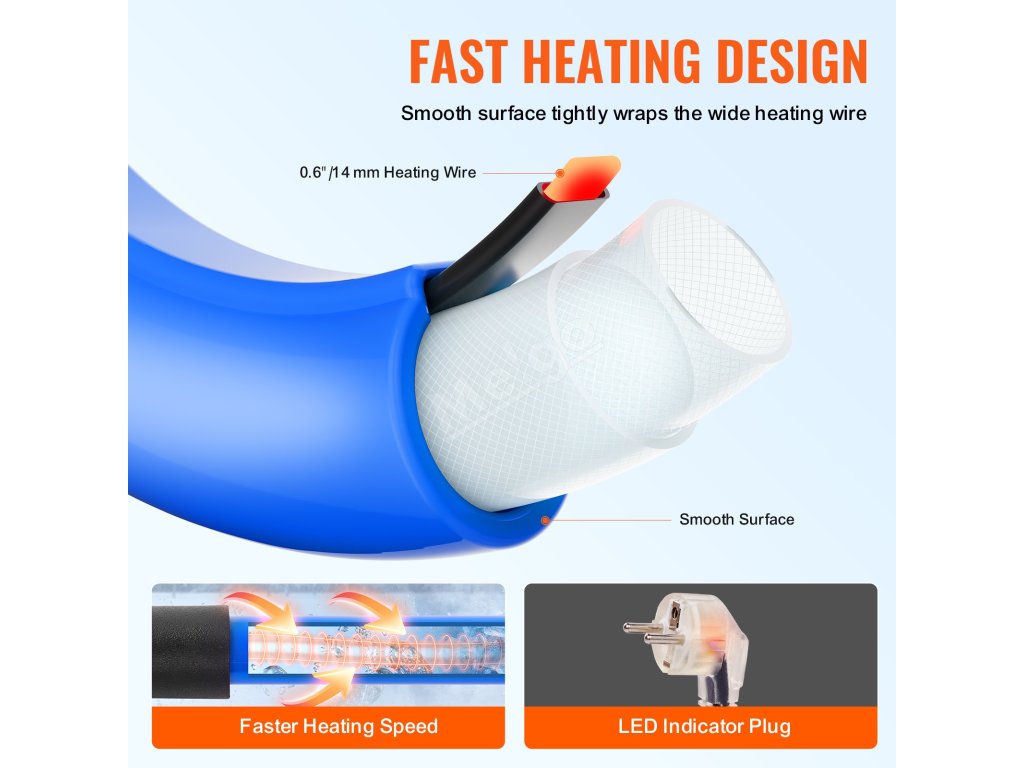 Široký topný drát je vybaven systémem vytápění s proměnlivou frekvencí, který zajišťuje, že teplota není příliš vysoká, a udržuje nízkou spotřebu energie. Pracuje také bez vody. Hladká vnější vrstva zajišťuje rychlejší ohřev.