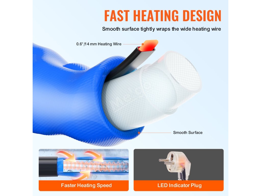 Široký topný drát je vybaven systémem vytápění s proměnlivou frekvencí, který zajišťuje, že teplota není příliš vysoká, a udržuje nízkou spotřebu energie. Pracuje také bez vody. Vlnitá vnější vrstva zajišťuje rovnoměrnější ohřev.