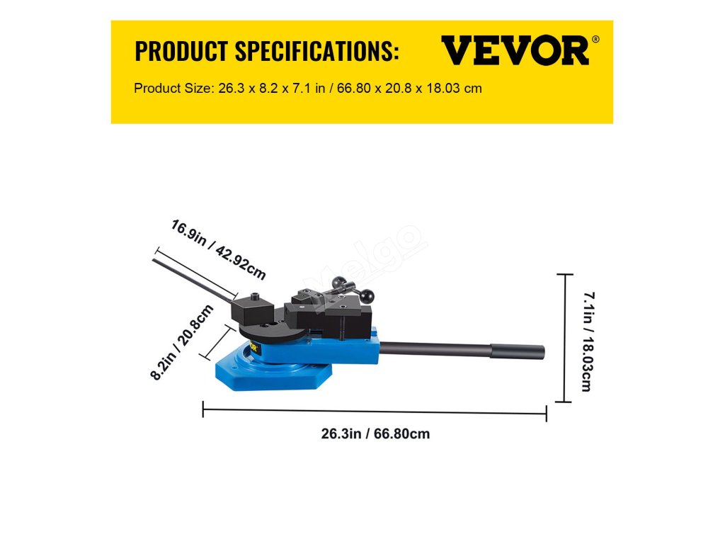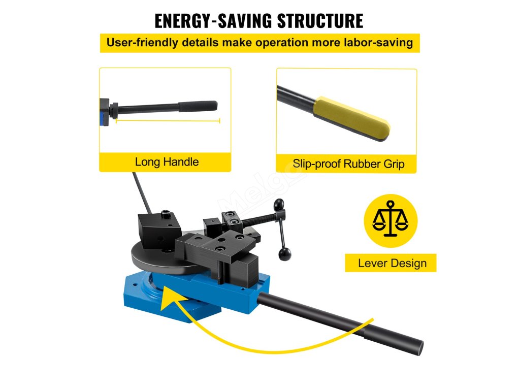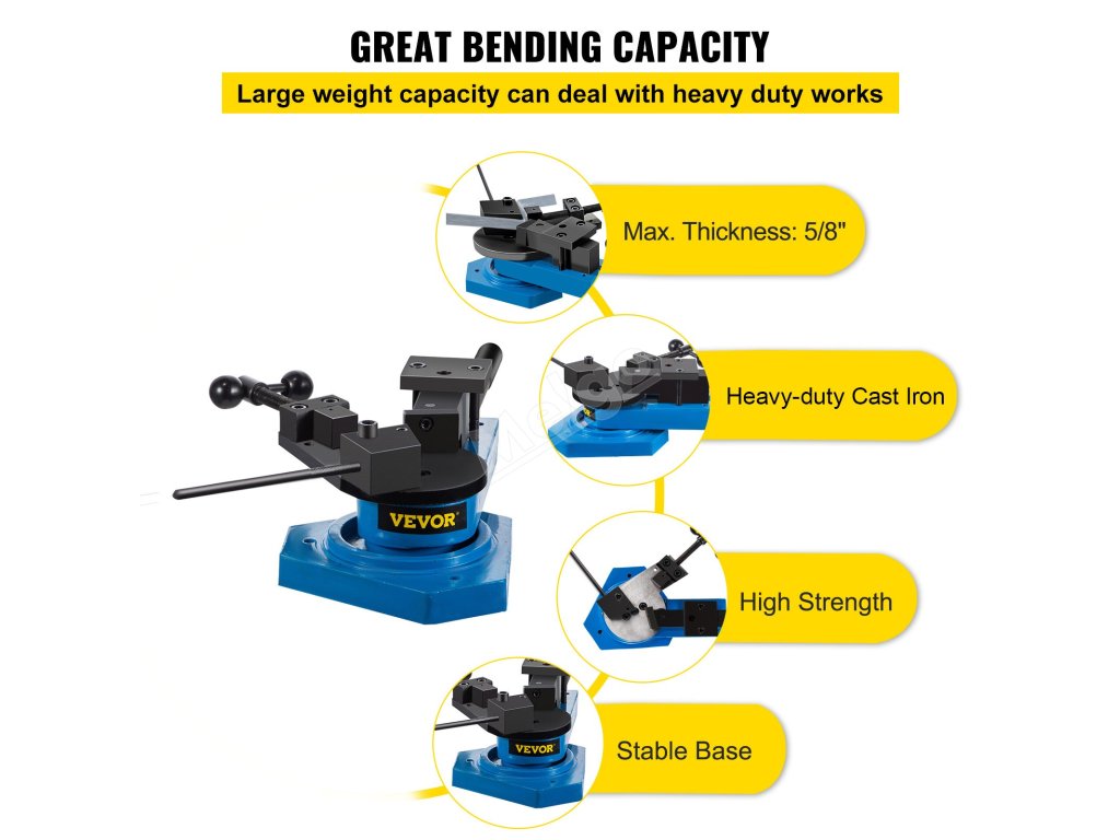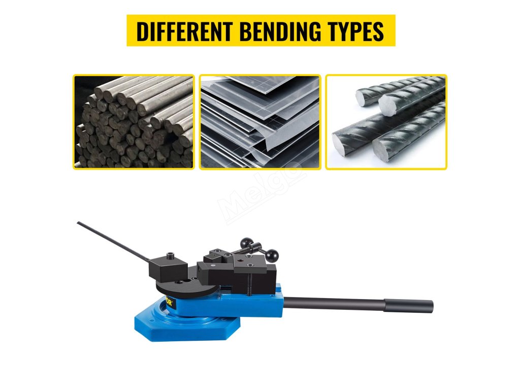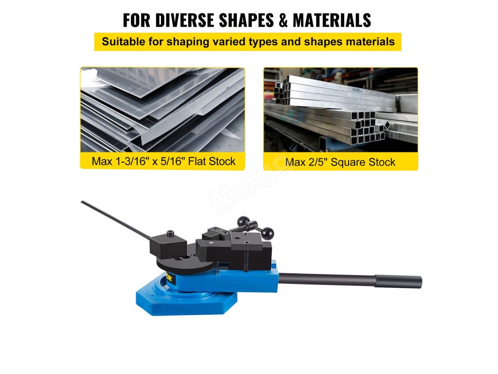 Tato ohýbačka kovů je kompatibilní s mědí, ocelí, hliníkem atd. Maximální velikost ploché oceli: 1-3/16" x 5/16" (30 x 8 mm); kulaté oceli: 5/8" (15,8 mm); čtvercové oceli: 19/32" (15 mm).