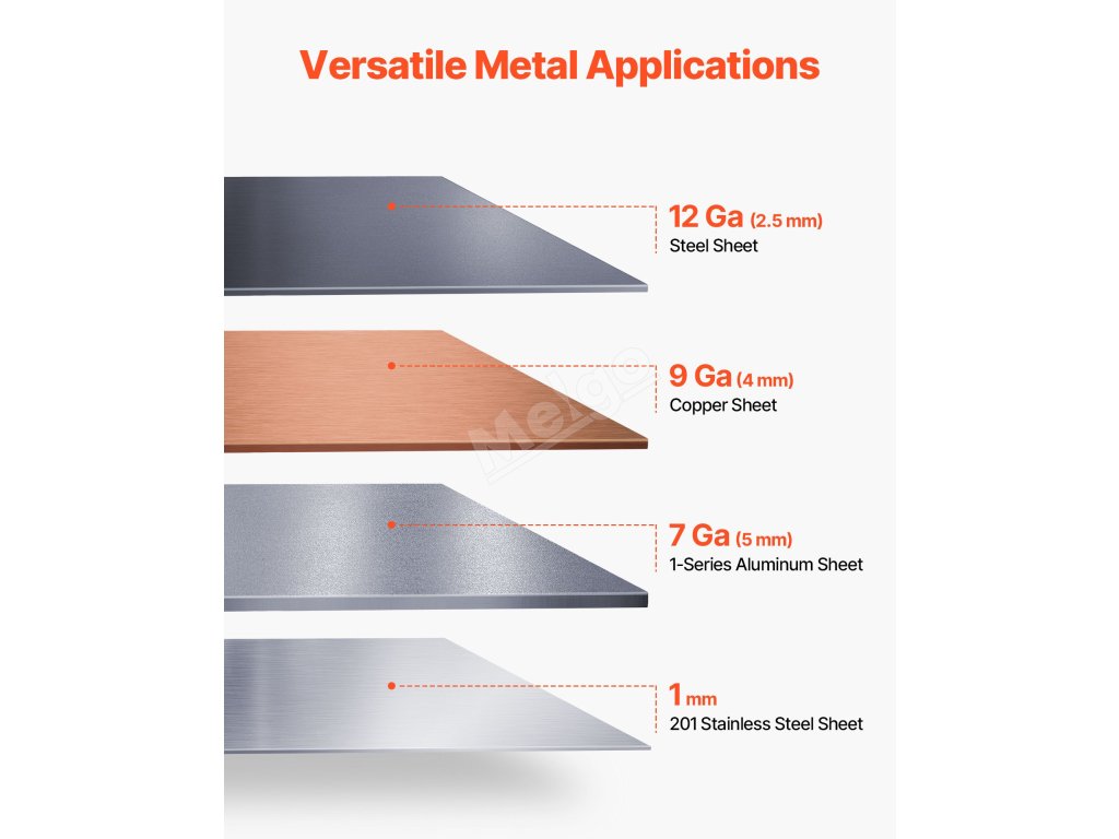 Skříňová a pánvová brzda si snadno poradí s měkkou ocelí, nerezovou ocelí, hliníkem a mědí. Ohýbá 12mm (2,5mm) měkkou ocel na jeden průchod - není třeba měnit stroje pro různé práce.