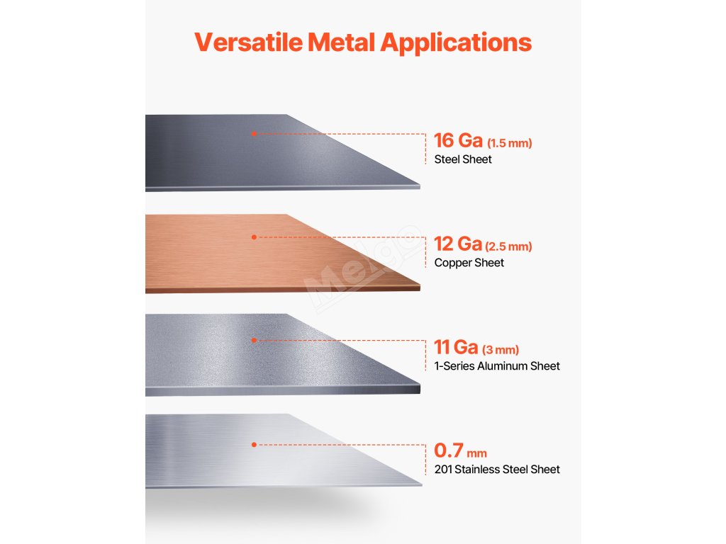 Skříňová a pánvová brzda si snadno poradí s měkkou ocelí, nerezovou ocelí, hliníkem a mědí. Ohýbá měkkou ocel o tloušťce 16 mm (1,5 mm) na jeden průchod - není třeba měnit stroje pro různé práce.