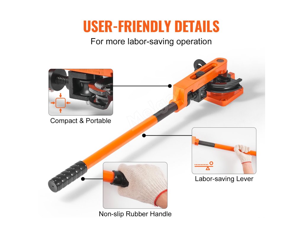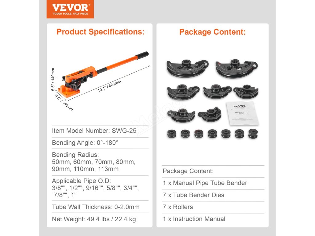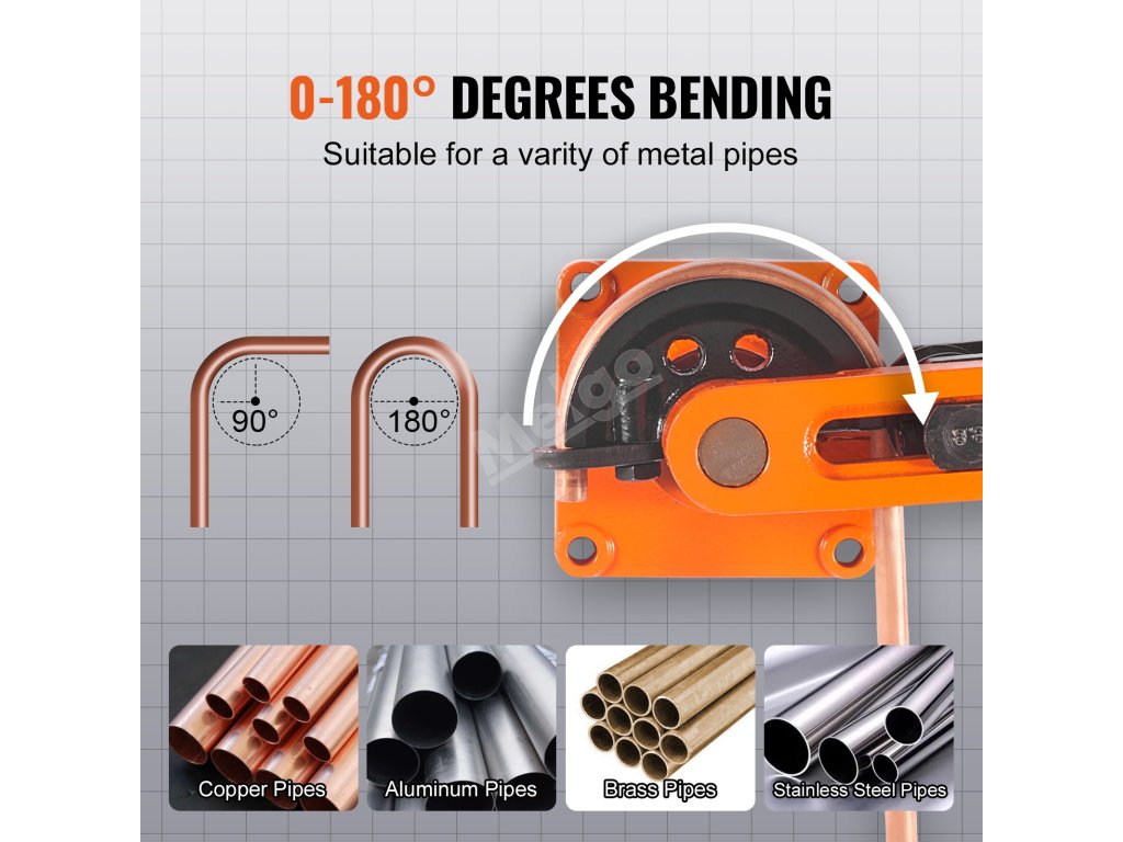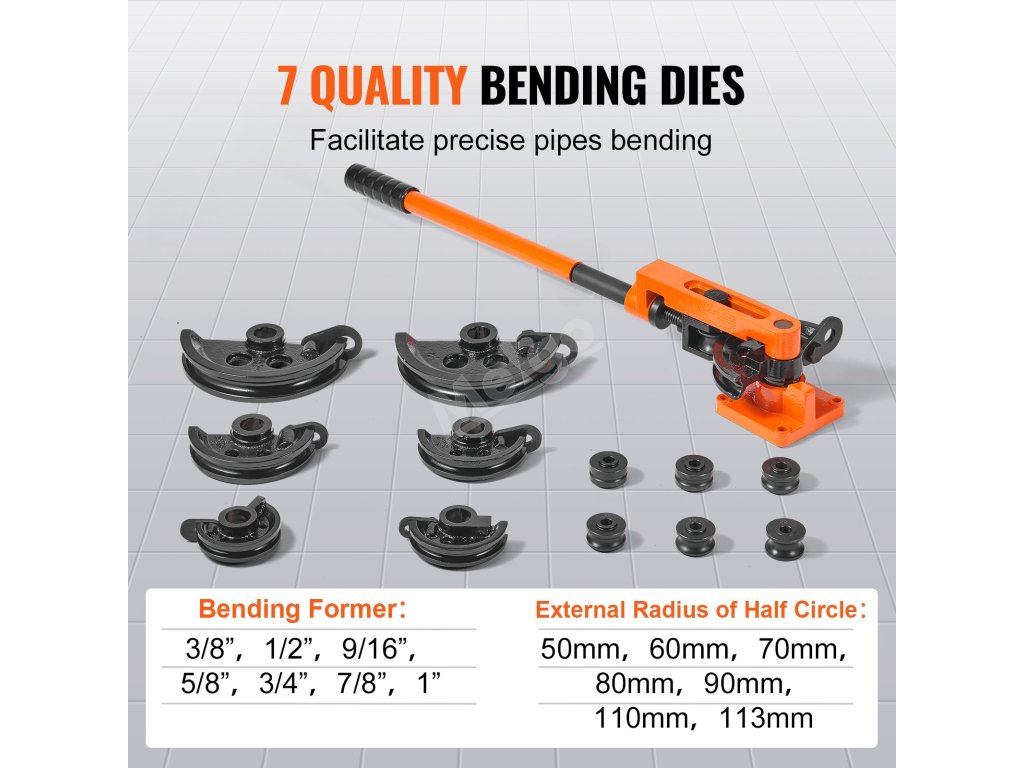 Ruční ohýbačka trubek VEVOR - dokonalý pomocník pro bezproblémové ohýbání trubek. Navrženo pro snadné ohýbání měděných, hliníkových, tenkých ocelových a nerezových trubek o tloušťce stěny 0-2 mm. 7 ohýbacích matric od 3/8" do 1" pro různé velikosti trubek. Důvěřujte společnosti VEVOR při přesném ohýbání trubek!