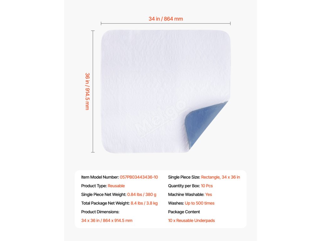 Naše omyvatelné podložky o rozměrech 34" x 36" v balení po 10 ks poskytují dlouhotrvající a spolehlivou ochranu povrchu. Tyto opakovaně použitelné podložky na lůžko jsou superabsorpční, rychleschnoucí a 100% nepropustné, rychle zadržují tekutiny a udržují postel, pohovku a matraci suchou a pohodlnou - ideální pro starší osoby, dospělé, děti a domácí zvířata.