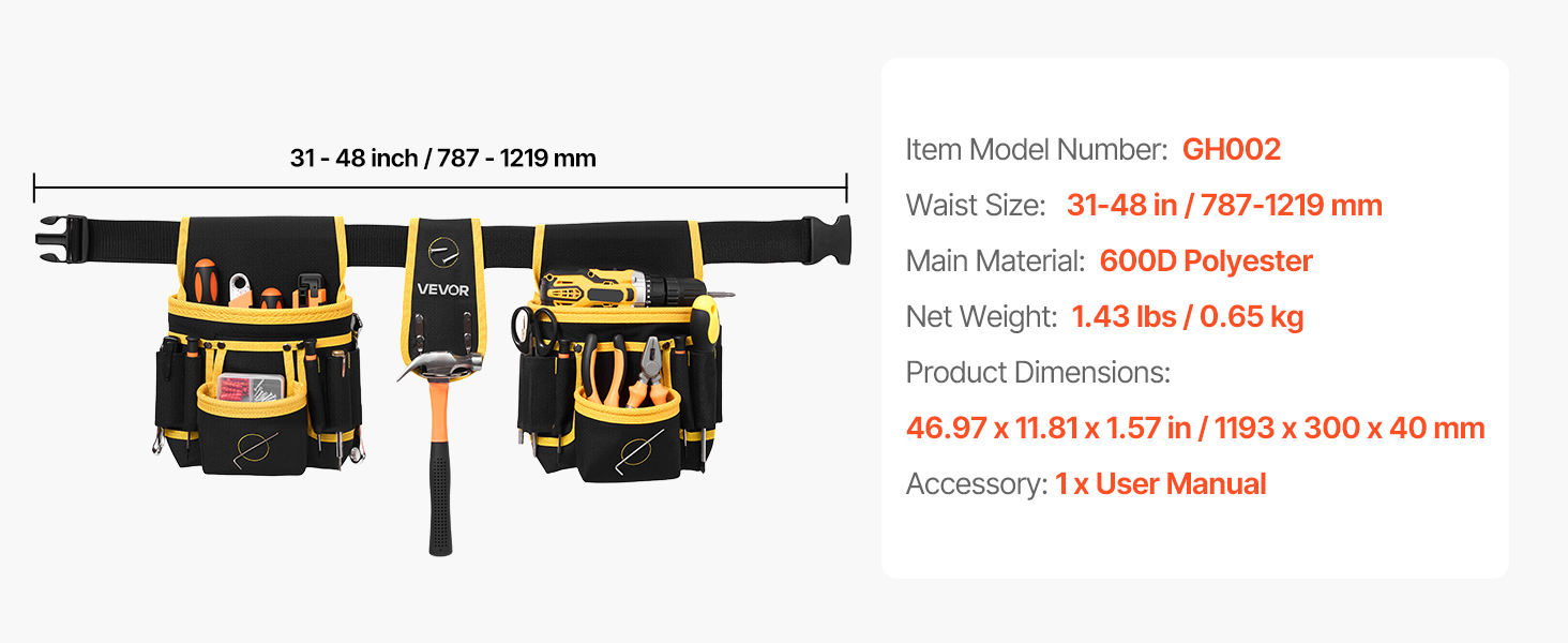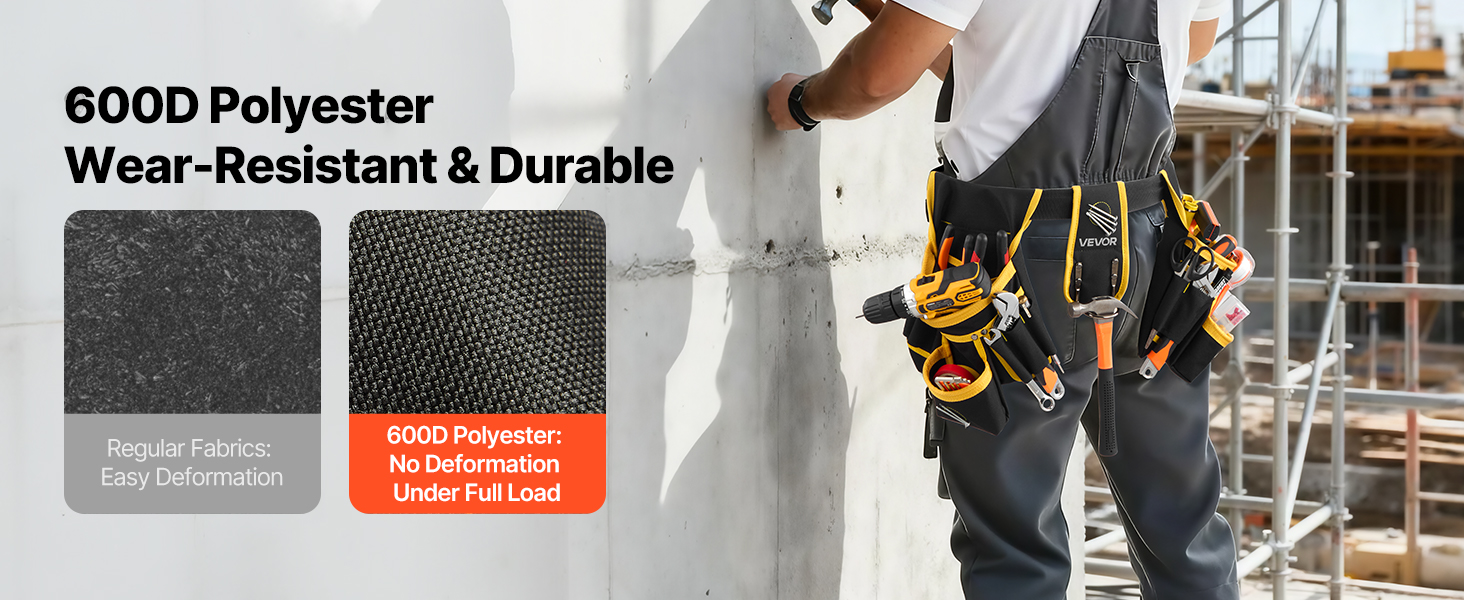 Tento tesařský opasek na nářadí je vyroben z polyesteru 600D a je odolný proti opotřebení, což zaručuje dlouhou životnost. Bezpečně drží hřebíky a elektrické nářadí bez deformace nebo poškození a zajišťuje stabilní a spolehlivý výkon.