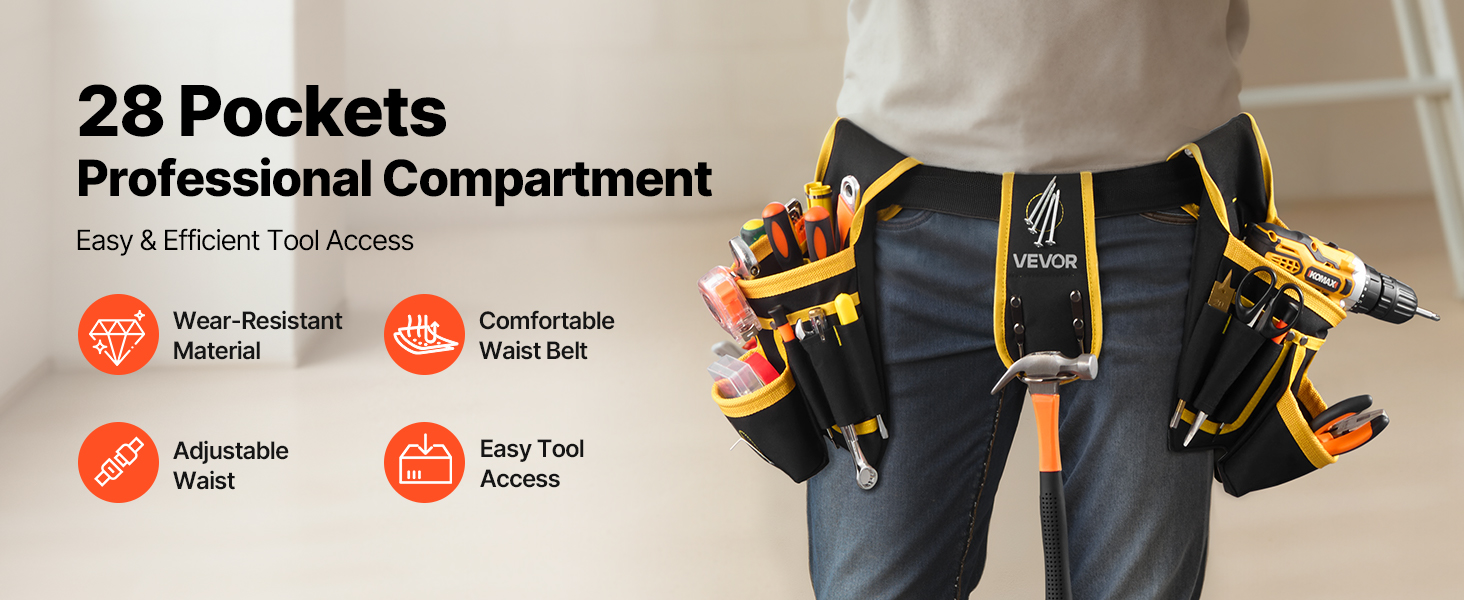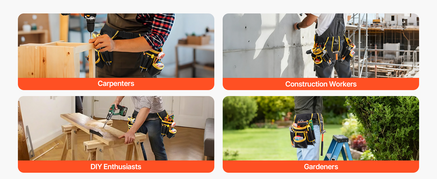 Ideální pro profesionální řemeslníky, stavební dělníky nebo kutily. Tento opasek na nářadí je vhodný pro domácí dekorace, zahradnické práce, opravy elektroinstalace a práce se dřevem a zajišťuje efektivní a pohodlný přístup k nářadí.