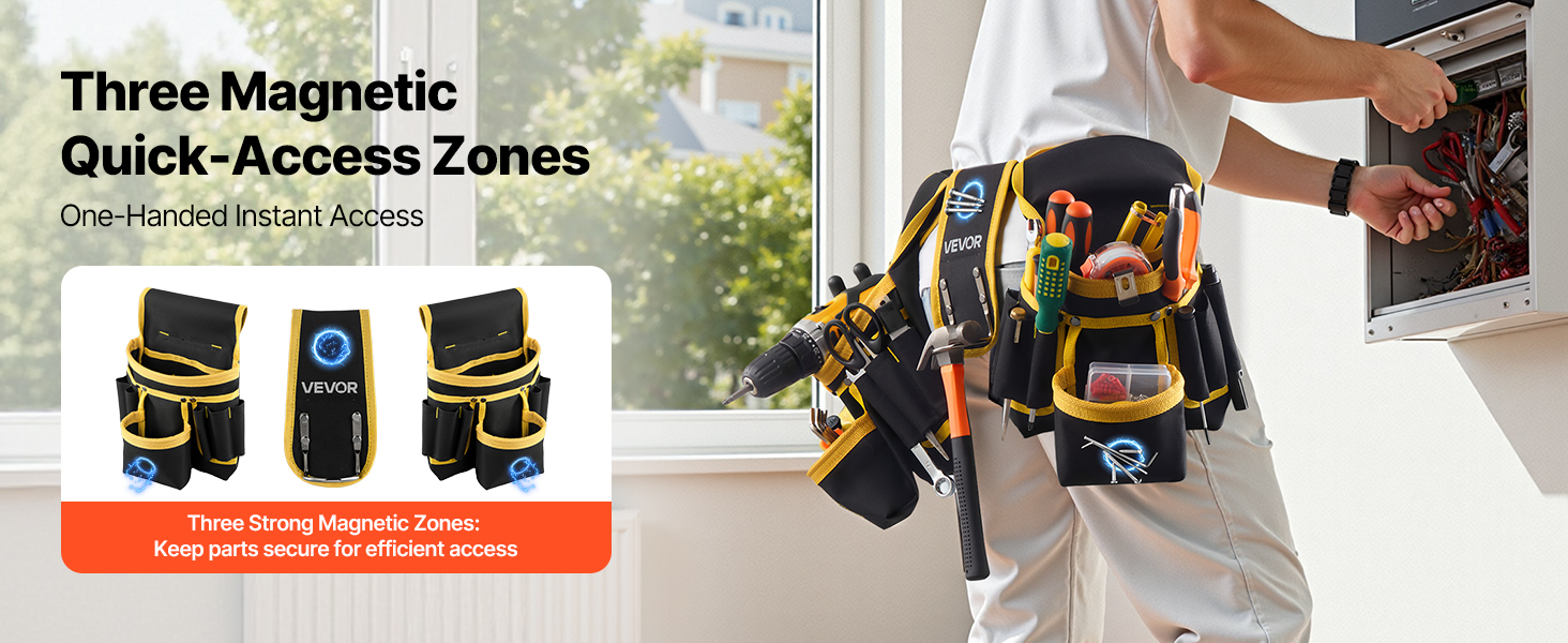 Tento opasek na nářadí pro truhláře je vybaven silnými magnety, které bezpečně drží šrouby, hřebíky a malé díly a umožňují přístup jednou rukou i ve stísněných nebo vyvýšených prostorech. Pracujte rychleji, bezpečněji a efektivněji díky hladké a pohodlné manipulaci s nářadím.