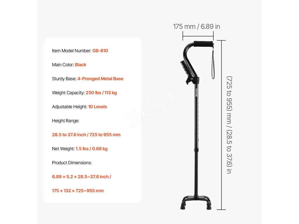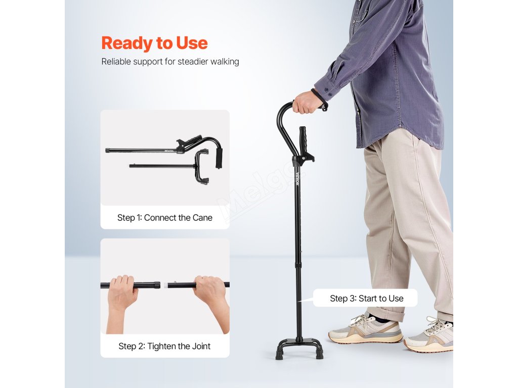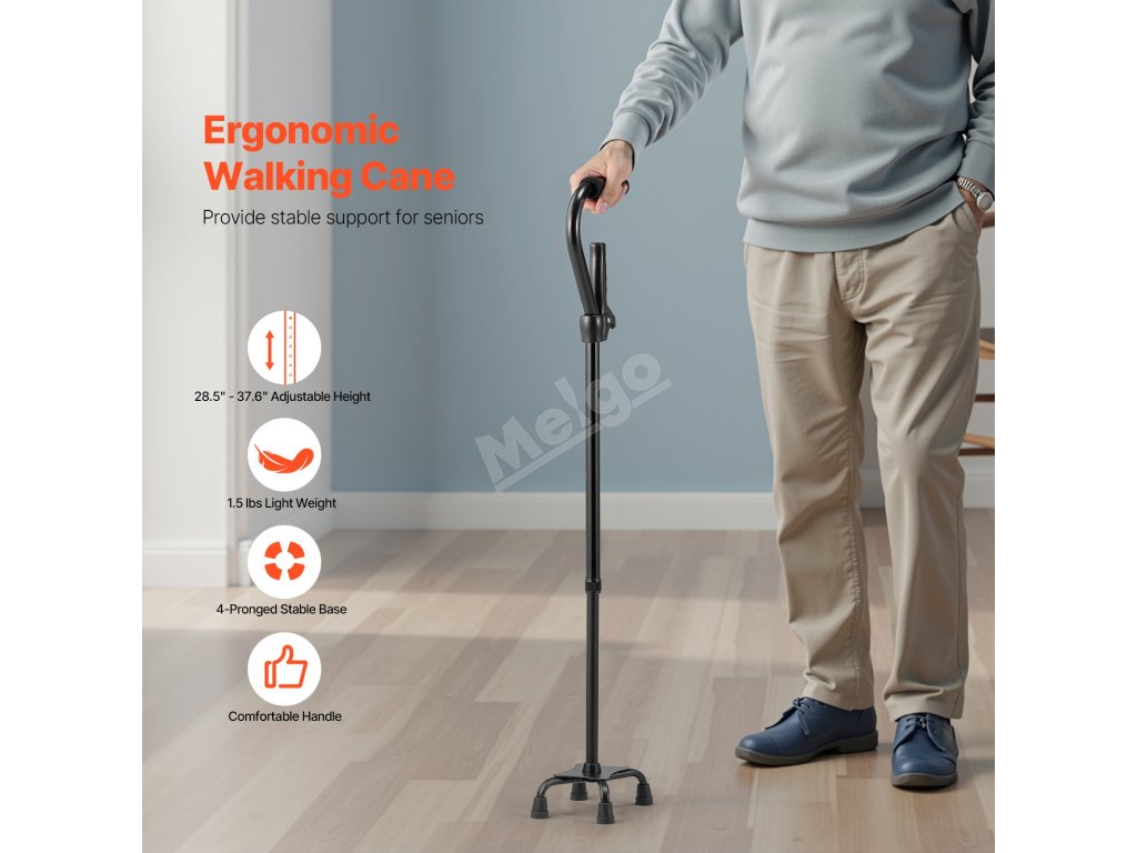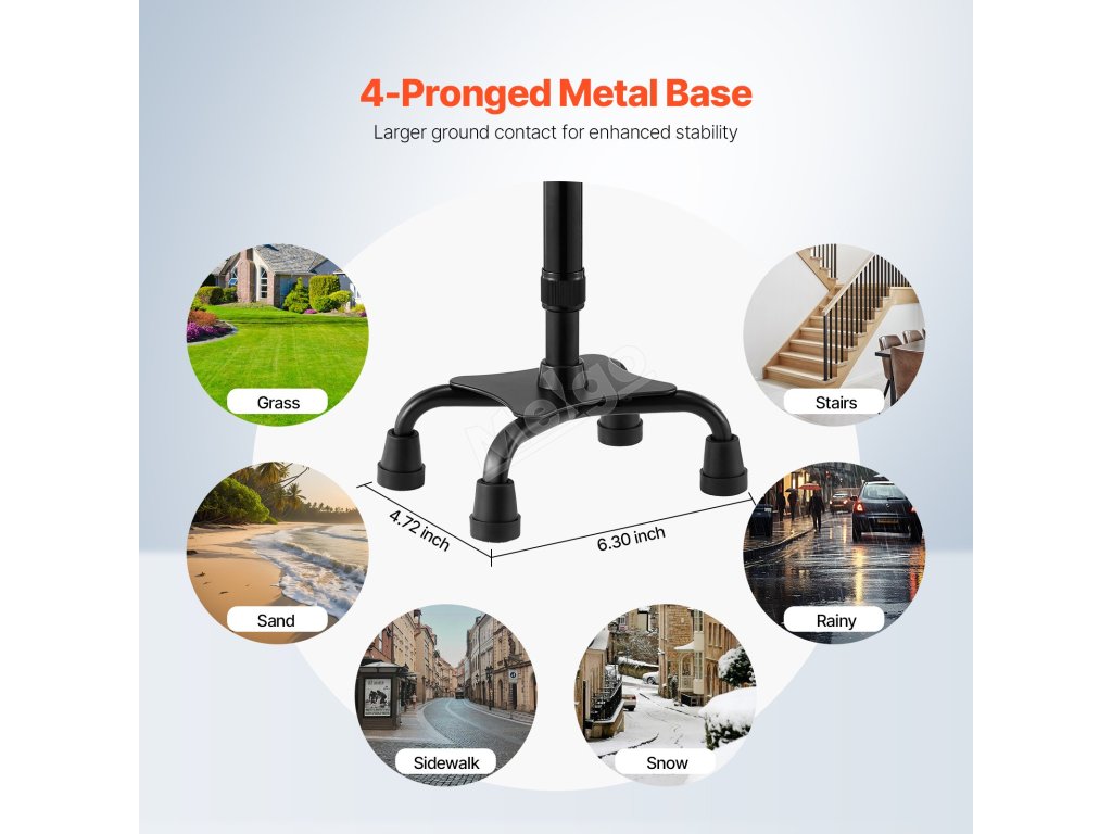 Tato vycházková hůl je vybavena protiskluzovou čtvercovou základnou, která zajišťuje skvělý kontakt se zemí a lepší trakci pro zajištění stability a pohodlí při chůzi. Bez námahy si poradí s různými povrchy a pomáhá uživatelům chodit s jistotou a užívat si bezpečnější chůzi.