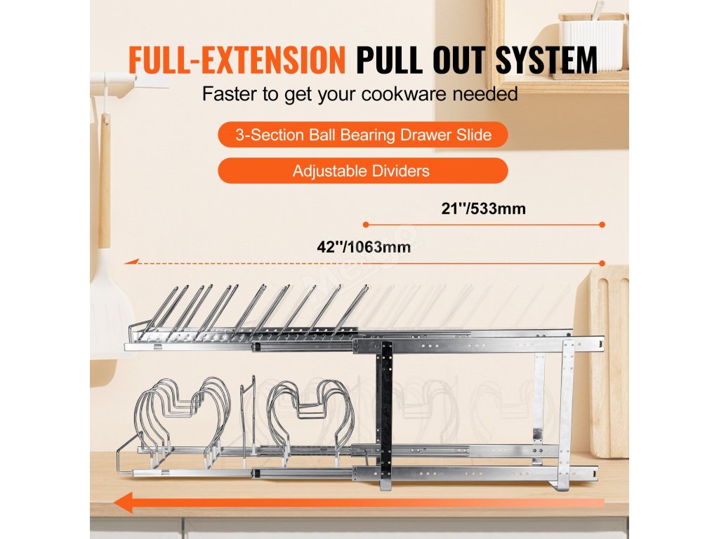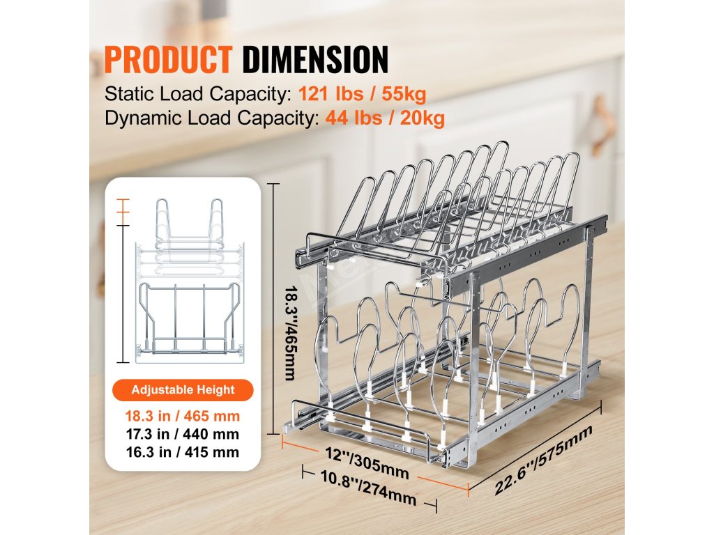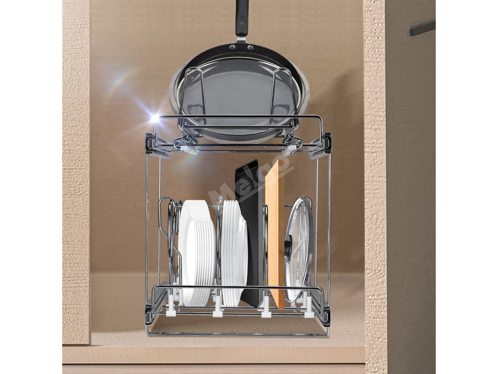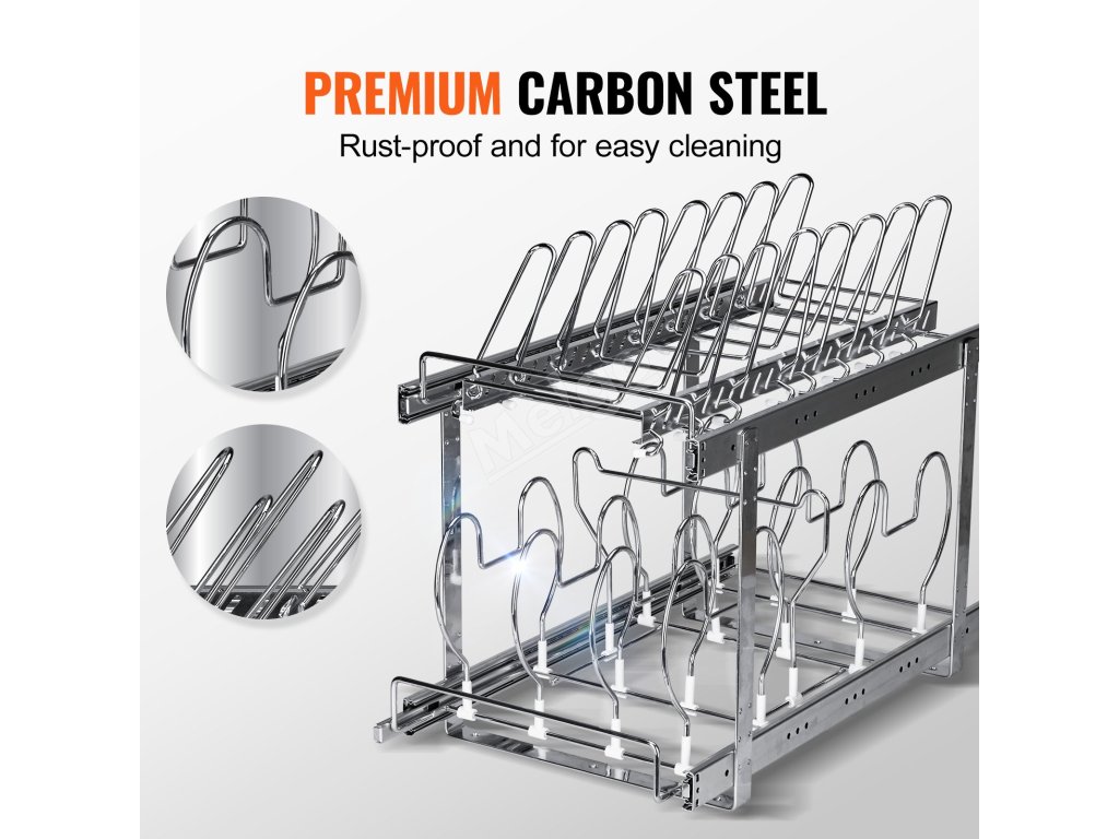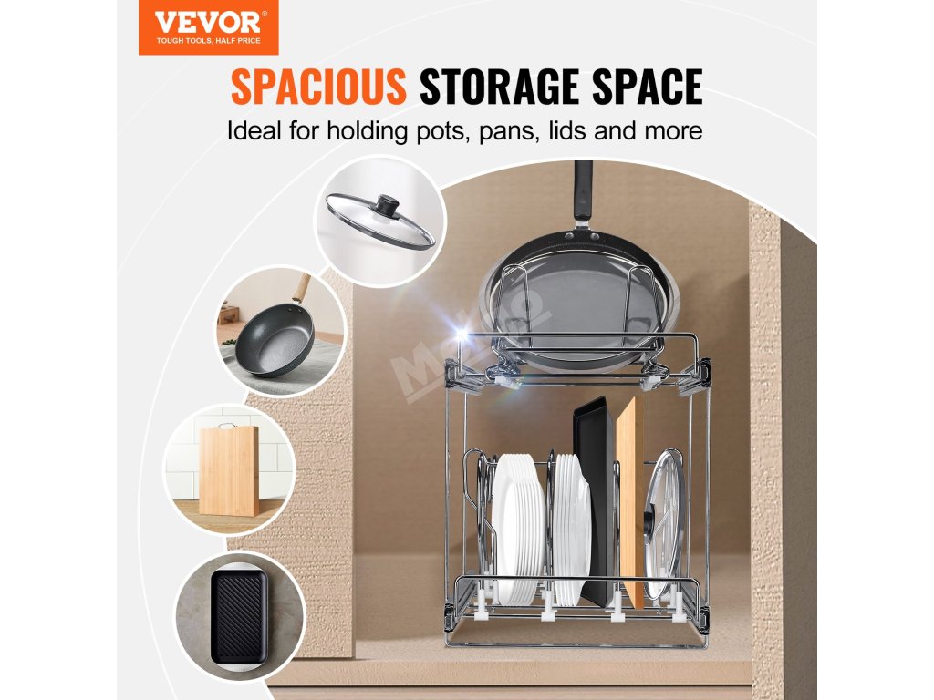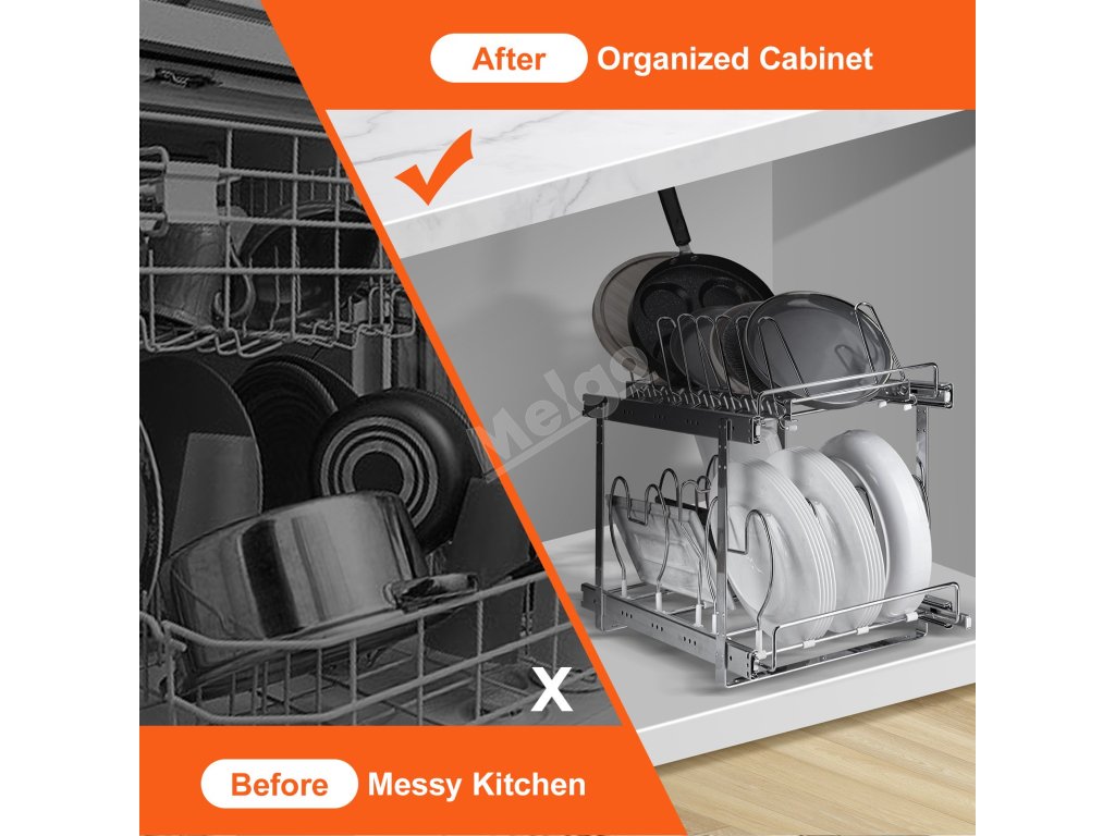 Náš stojan na pánve a hrnce je navržen tak, aby maximalizoval prostor v kuchyni. Je ideální pro ukládání hrnců, pánví, prkének na krájení, pokliček a dalších předmětů. Tento úložný regálový organizér vyrobený z uhlíkové oceli se snadno vysouvá a umožňuje vám snadný přístup a výběr toho, co potřebujete.