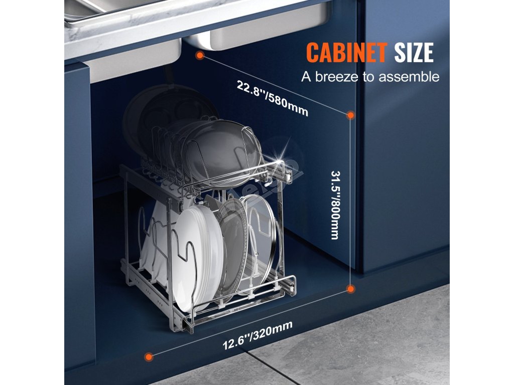 Nejprve zkontrolujte velikost skříně. Tento stojan se používá ve skříních o rozměrech 12,6 × 22,8 × 31,5 palce. Náš odolný organizér na krájecí prkénka lze nainstalovat pomocí několika jednoduchých šroubů, takže můžete snadno uspořádat své skříňky.