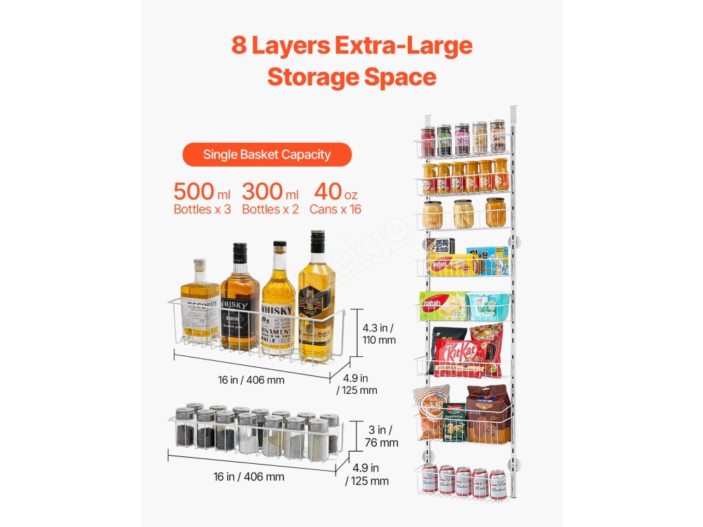 Tento organizér do špajze nad dvere obsahuje 8 veľkých košov, ktoré maximalizujú vašu úložnú kapacitu! Môžete ho použiť ako organizér na dvere špajze, stojan na korenie alebo organizér na skladovanie v skrini - ideálny pre malé priestory.
