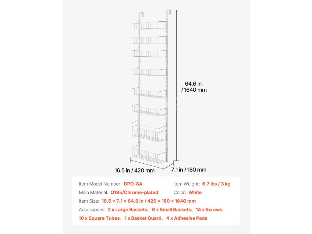 Tento organizér do spíže nade dveřmi je vybaven 8 velkými koši, které maximalizují vaši úložnou kapacitu! Můžete jej použít jako organizér na dveře spíže, stojan na kořenky nebo organizér pro skladování ve skříni - ideální pro malé prostory.