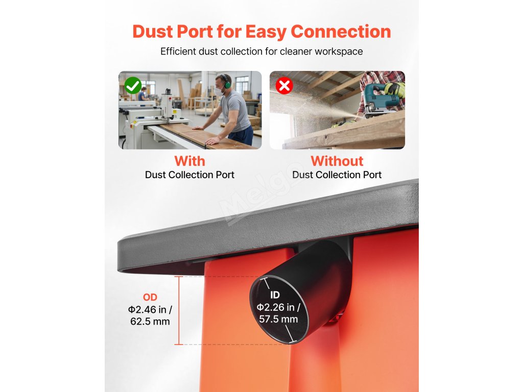 Vřetenová bruska je vybavena prachovým otvorem o průměru 57,5 mm (ID) a 62,5 mm (OD), který umožňuje snadné připojení k vysavačovým hadicím pro bezprašný provoz, což snižuje množství čisticích prací, prodlužuje životnost zařízení a udržuje čistotu pracovního prostoru.