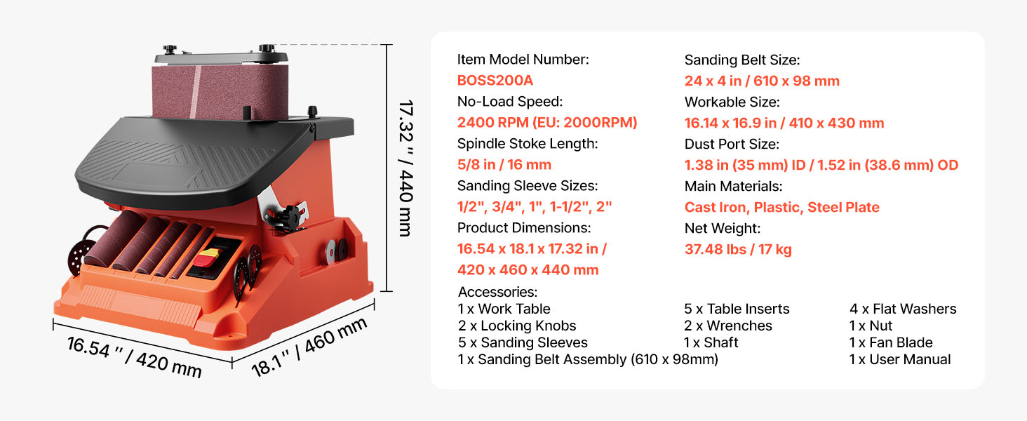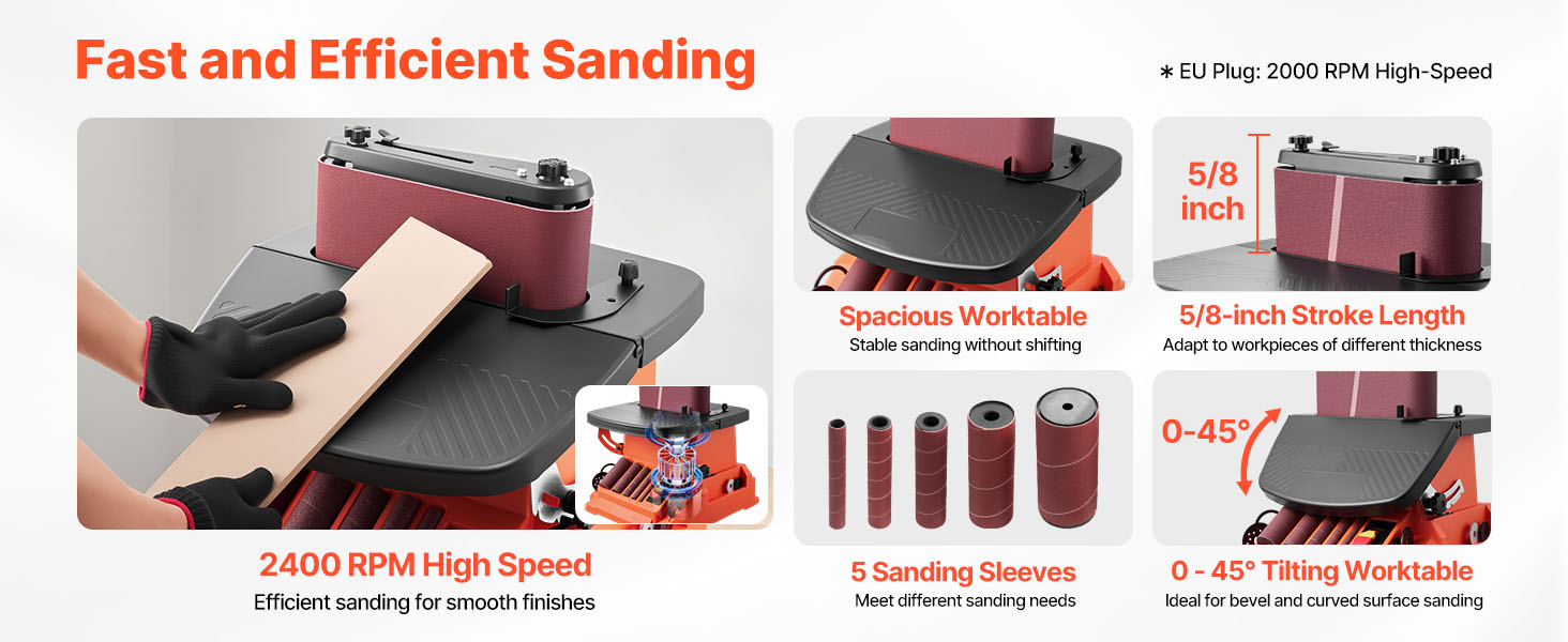 Oscilační pásová a vřetenová bruska VEVOR s 2000 otáčkami za minutu zajišťuje hladké broušení pro dokončování nábytku nebo kutilské projekty. Díky brusnému pásu 610 x 98 mm, 5 brusným pouzdrům, 16mm zdvihu a naklápěcímu pracovnímu stolu poskytuje přesnější a efektivnější broušení hladkých povrchů.