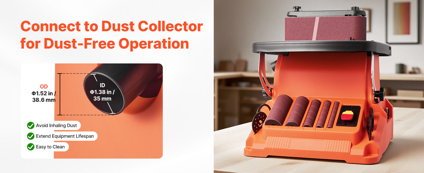 Vřetenová bruska je vybavena prachovým otvorem o průměru 35 mm a prachovým otvorem o průměru 38,6 mm, což umožňuje snadné připojení k vysavačovým hadicím pro bezprašný provoz, snižuje množství čisticích prací, prodlužuje životnost stroje a udržuje pracovní prostor čistý.