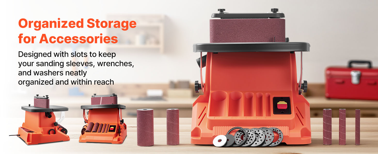 Integrované otvory udržují brusná pouzdra a stolní destičky přehledně uspořádané, čímž zabraňují ztrátě dílů a zajišťují rychlý přístup při práci.