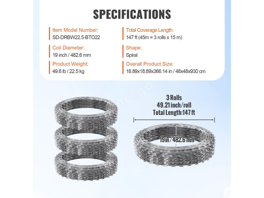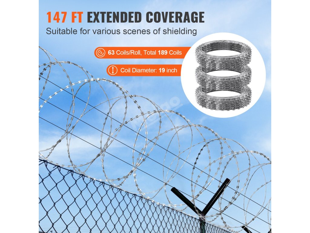 Náš žiletkový drát je opatřen vysoce odolným žárovým zinkováním, které zaručuje odolnost proti korozi. S rozsáhlým pokrytím 147 stop, ostrými čepelemi 0,02" a jádrem drátu o tloušťce 0,16" poskytuje výjimečnou ochranu dvojitou šroubovicí. Navíc se dodává s ochrannými rukavicemi pro instalaci bez zranění.
