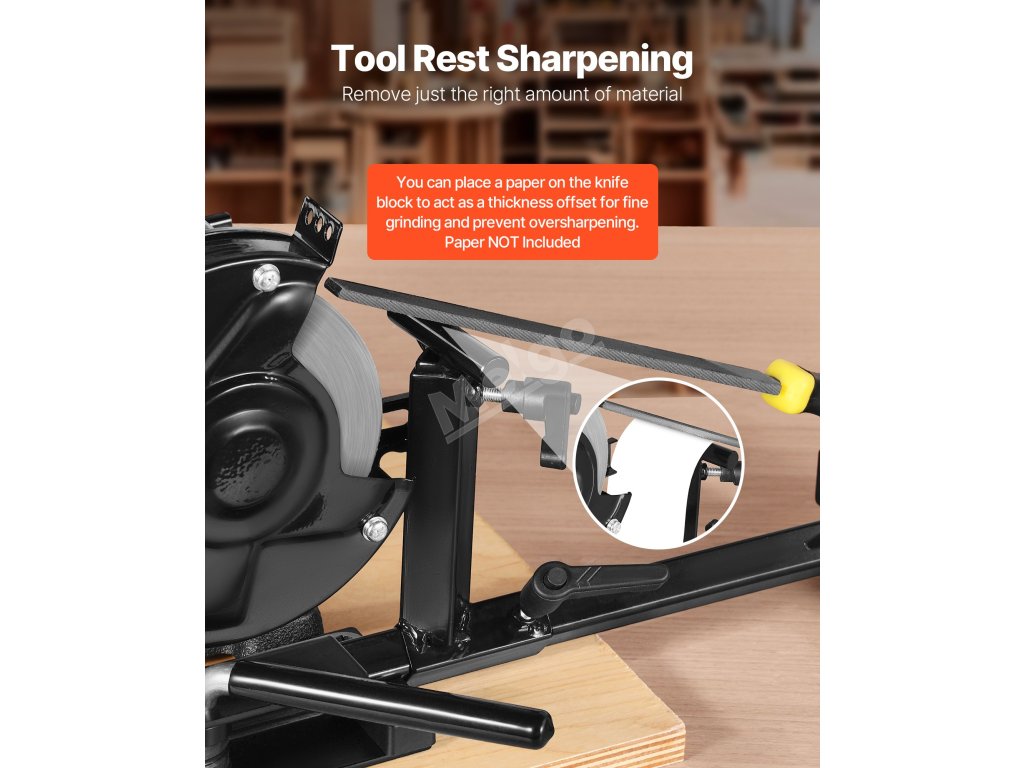 Dodávaná opěrka nástroje vám pomůže odebrat přesně tolik materiálu, kolik je potřeba k přesnému broušení. Na blok kotouče můžete umístit papír, který slouží jako tloušťkový posun, abyste zajistili jemné broušení a zabránili přebroušení. (Papír není součástí dodávky)