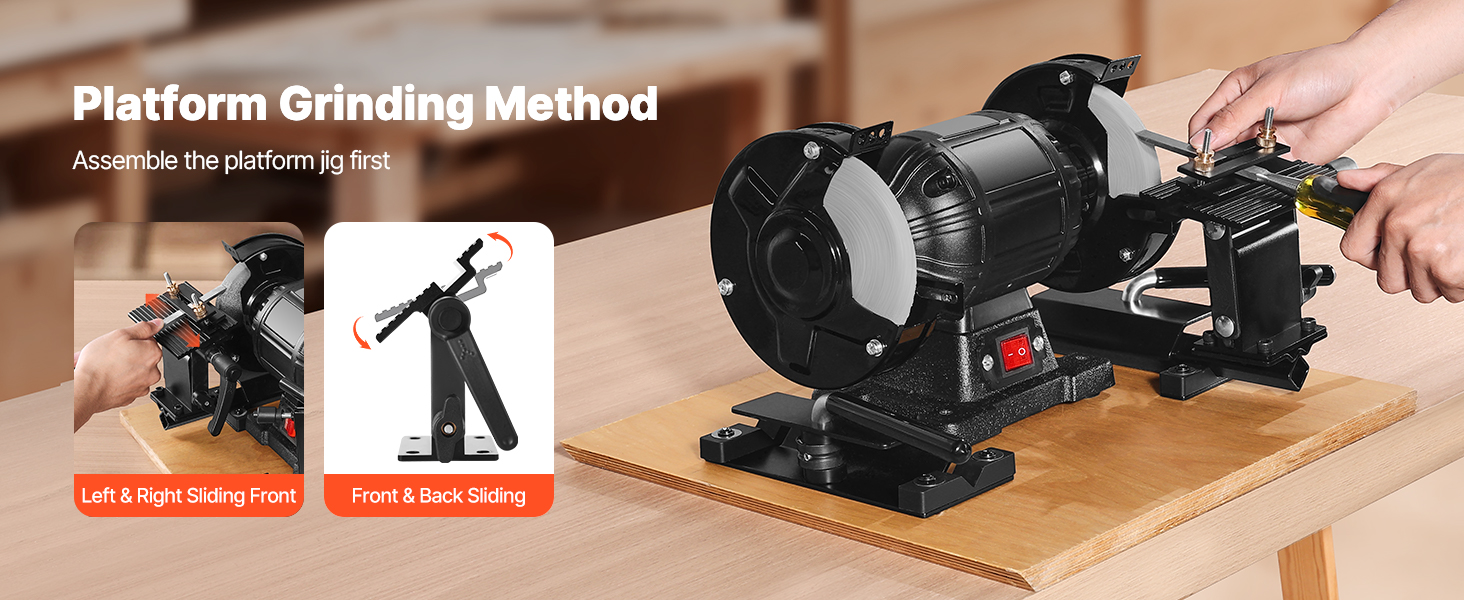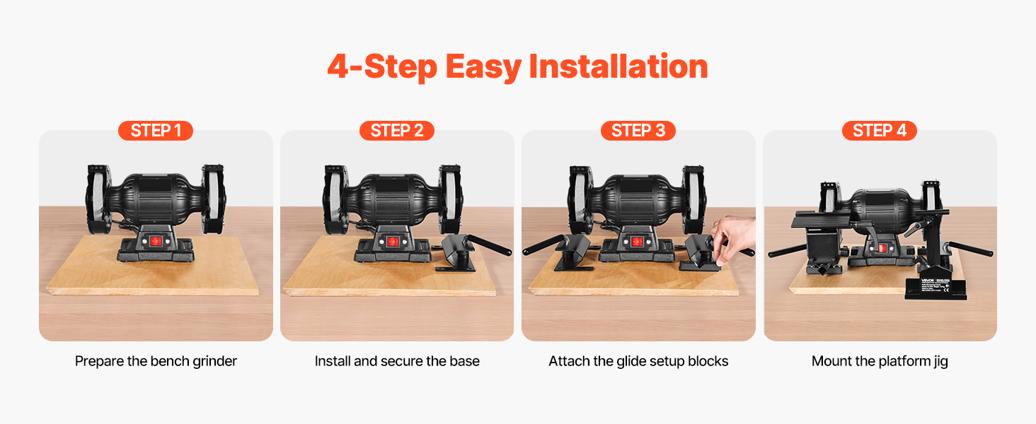 Stačí připravit stolní brusku, upevnit základnu, připevnit bloky pro nastavení posuvných ploch a namontovat přípravek na plošinu - není třeba žádné složité montáže ani nářadí. Ať už jste domácí kutil, nebo zkušený profesionál, budete brousit s přesností během okamžiku!