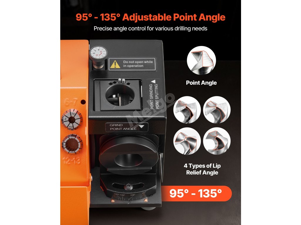 Nastavitelný úhel hrotu 95° - 135° pro různé typy vrtáků a dosažení přesných a konzistentních výsledků broušení.